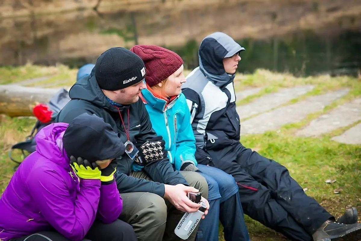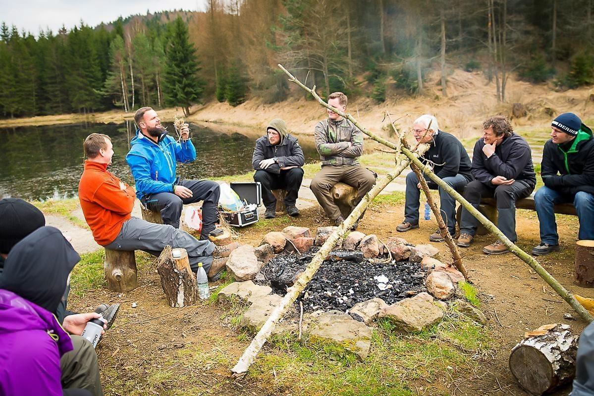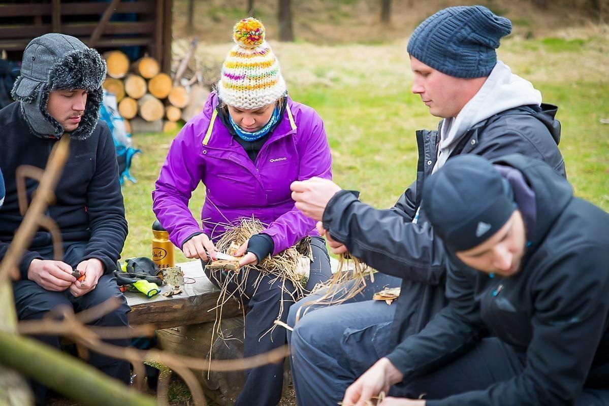 Gruppe hört einem Vortrag über Überlebenstechniken in der Natur zu