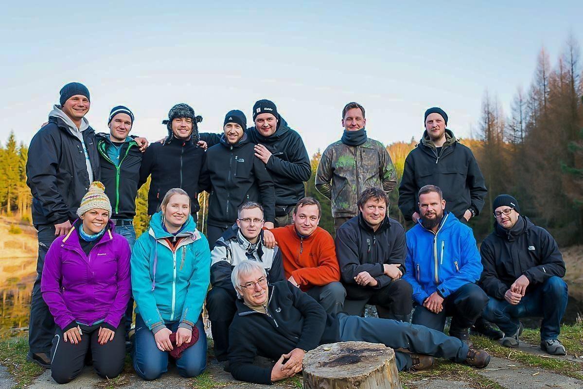 Gruppe von Personen steht im Wald um eine Holzstange, Rucksäcke liegen am Boden
