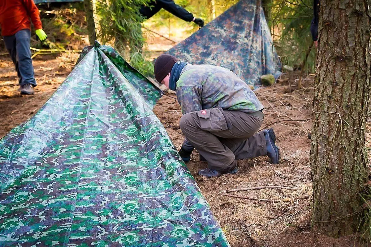 Zwei Personen arbeiten im Wald an einer Tarp-Notunterkunft