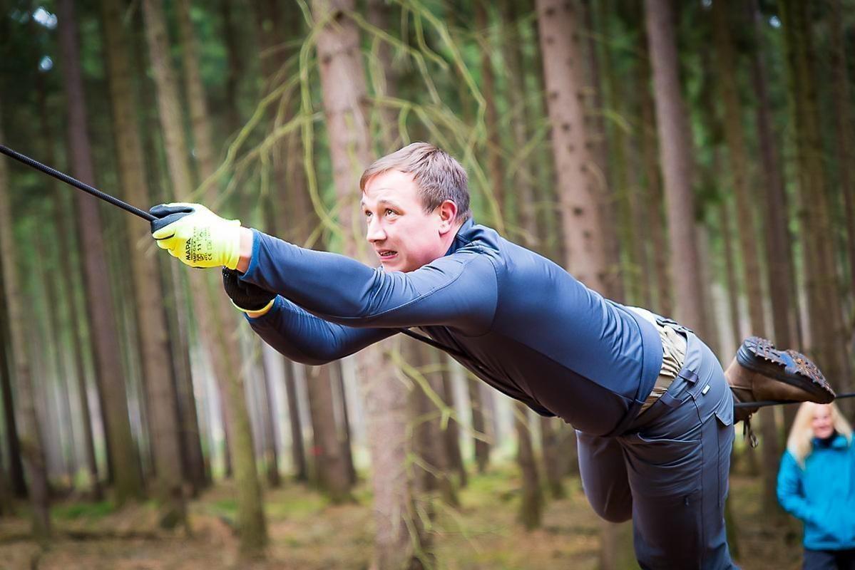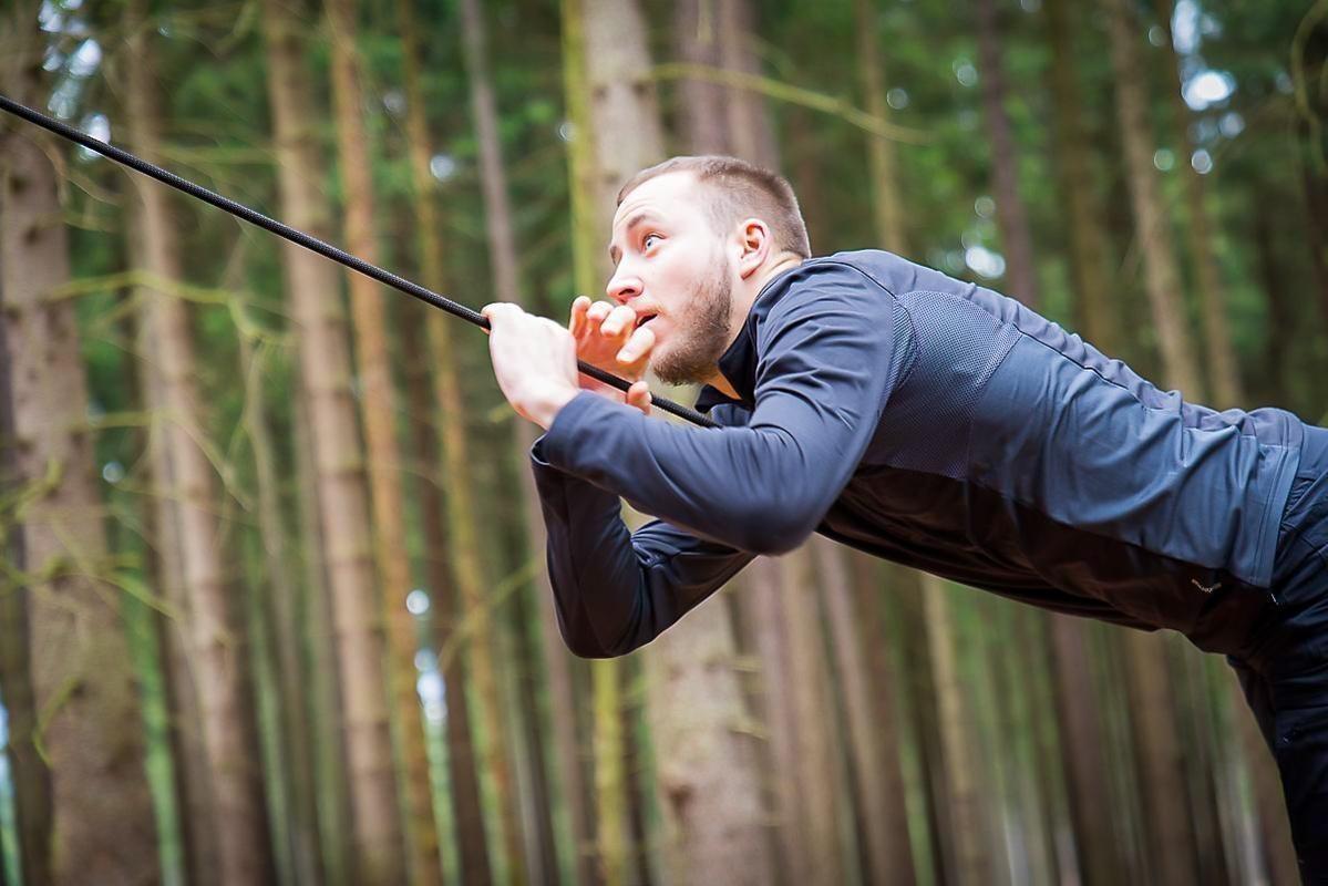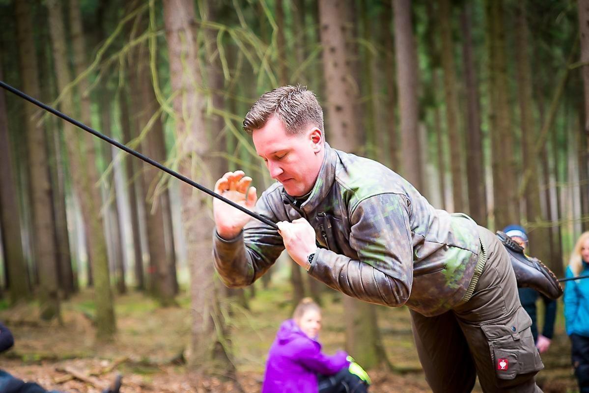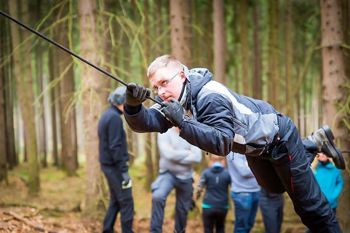Teilnehmer überquert eine selbstgebaute Seilbrücke im Wald