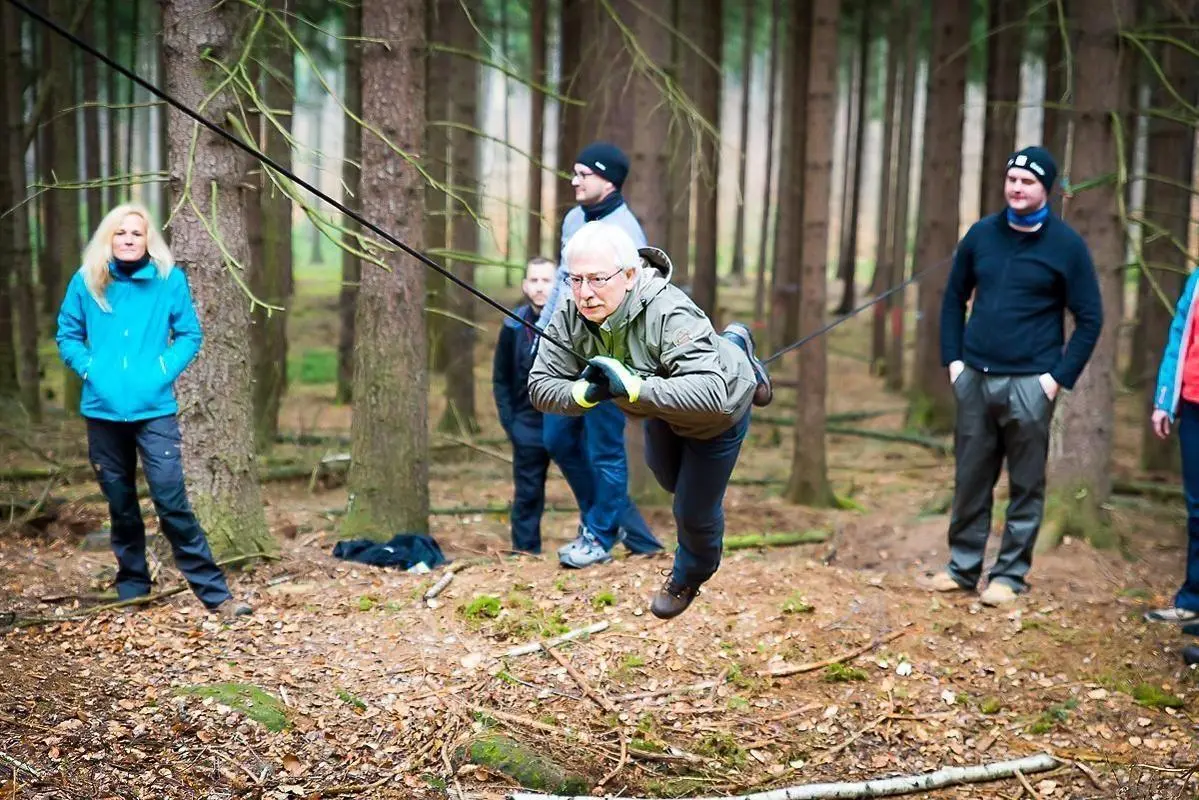 Mann überquert selbstgebaute Seilbrücke im Wald, andere Personen im Hintergrund