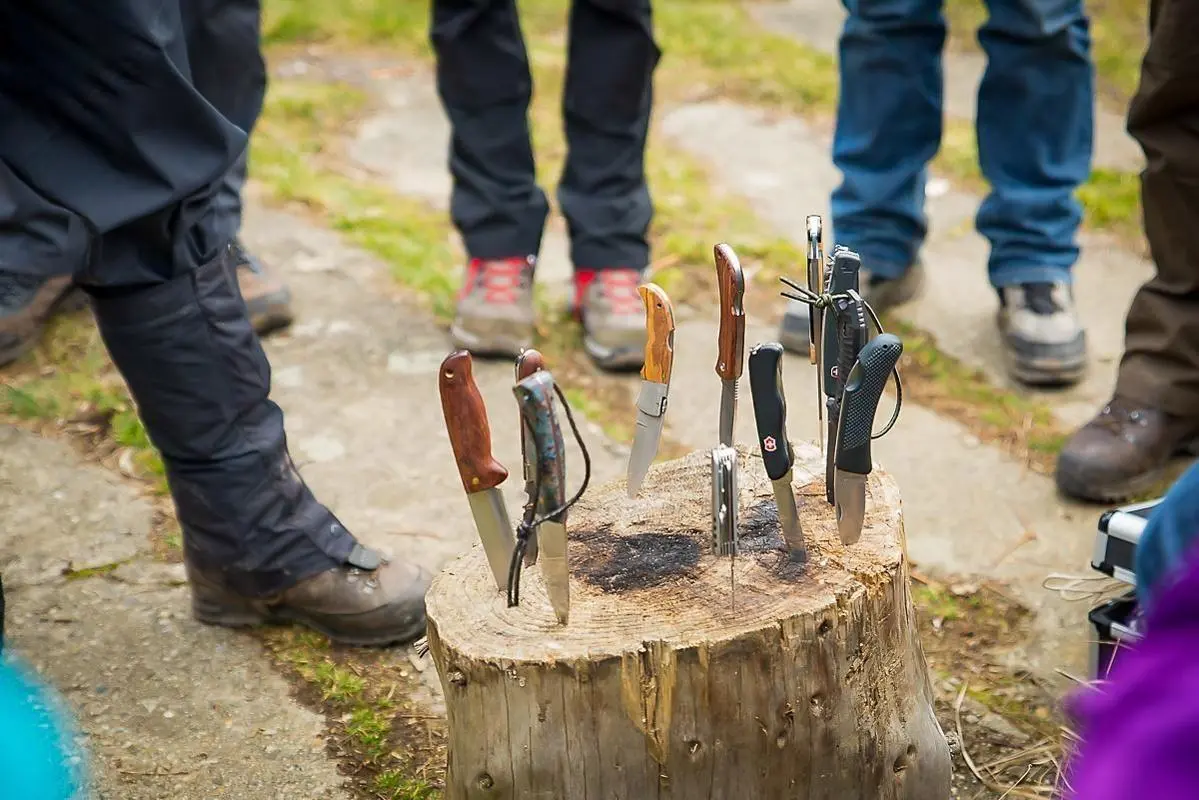 Mehrere Messer stecken in einem Baumstumpf, umgeben von Personen in Outdoor-Bekleidung