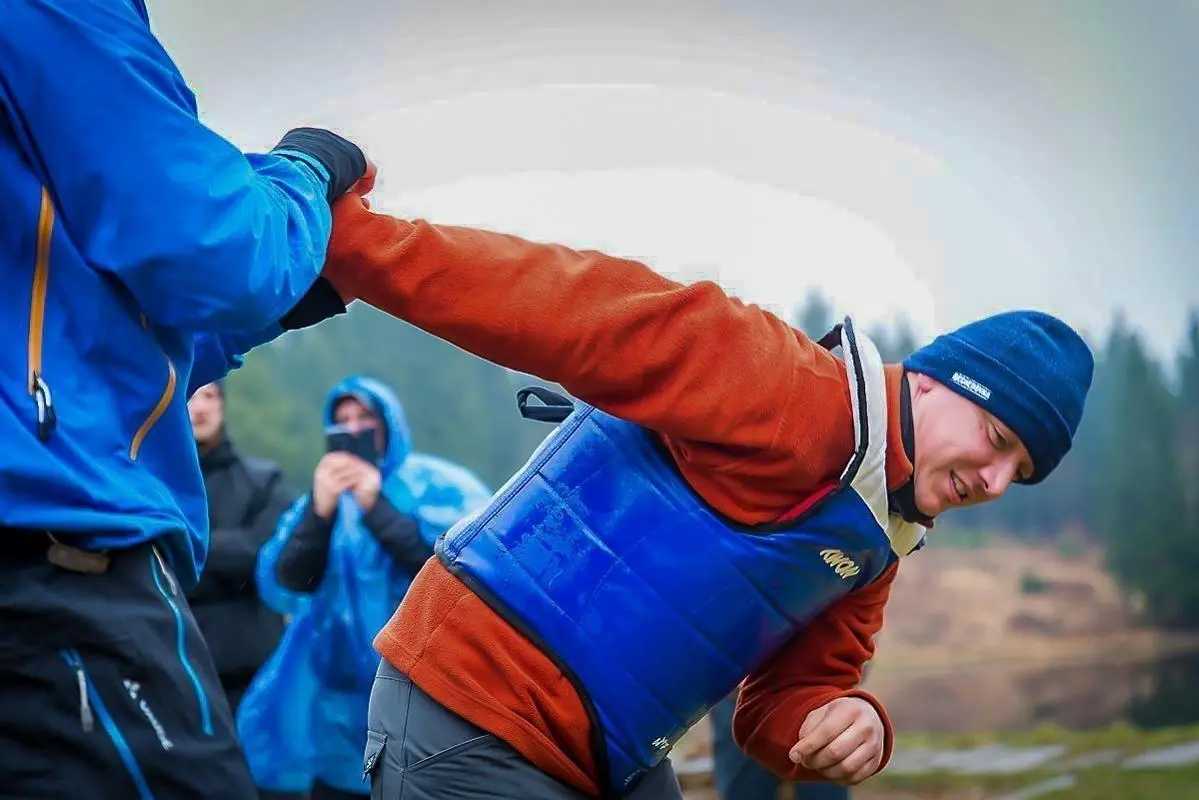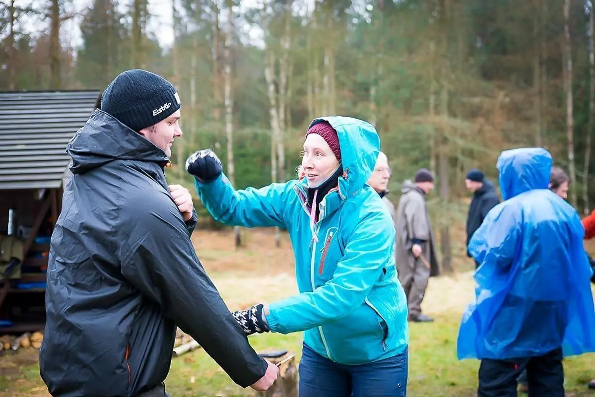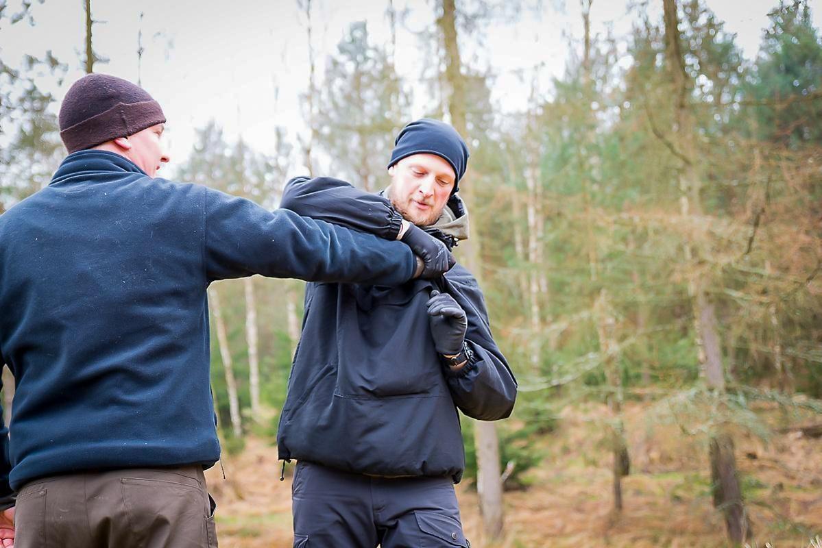 Zwei Personen in Outdoor-Bekleidung führen eine Übung zur Selbstverteidigung durch