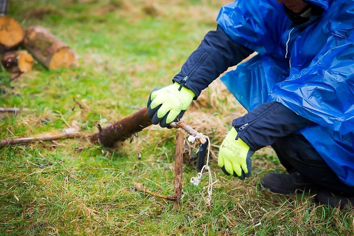 Gruppe baut eine selbstgebaute Konstruktion aus Ästen zwischen zwei Bäumen