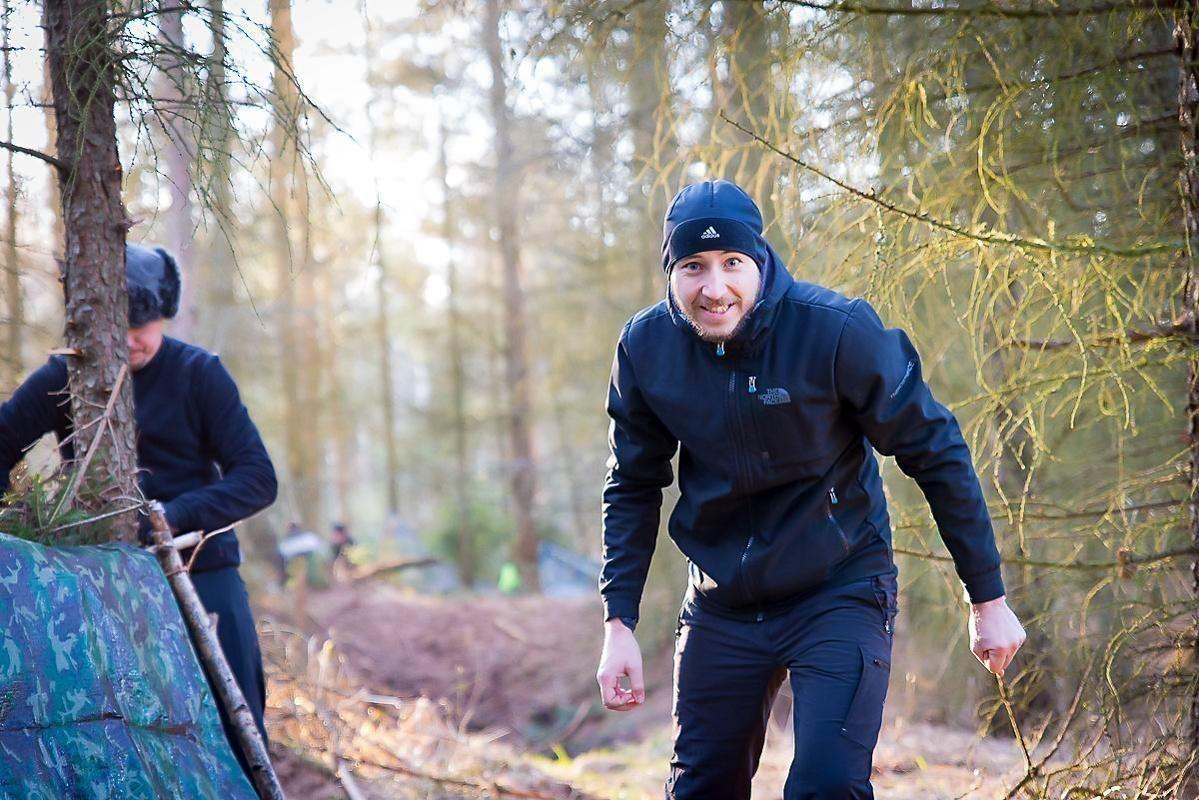 Mann überprüft die Befestigung einer Tarp-Notunterkunft im Wald