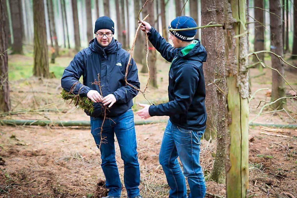 Gruppe betrachtet selbstgebaute Konstruktion im Wald, umgeben von Bäumen