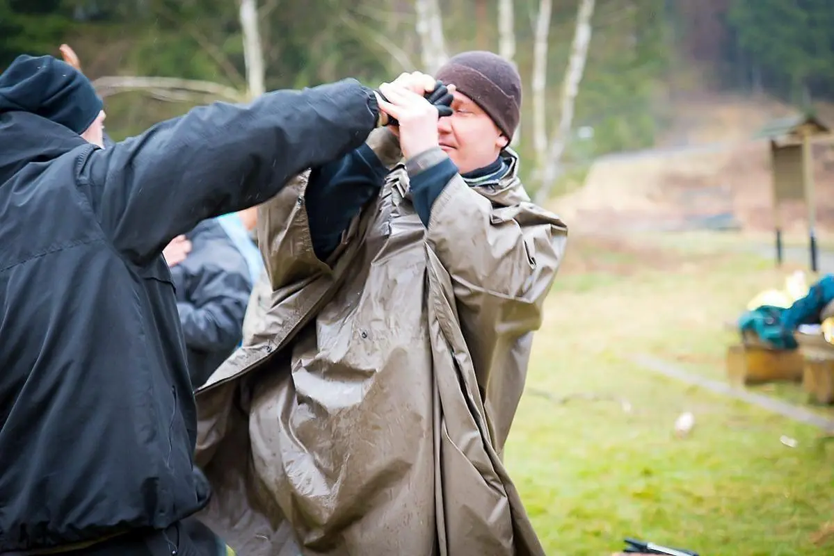 Zwei Personen helfen sich beim Anziehen eines wasserdichten Überwurfs