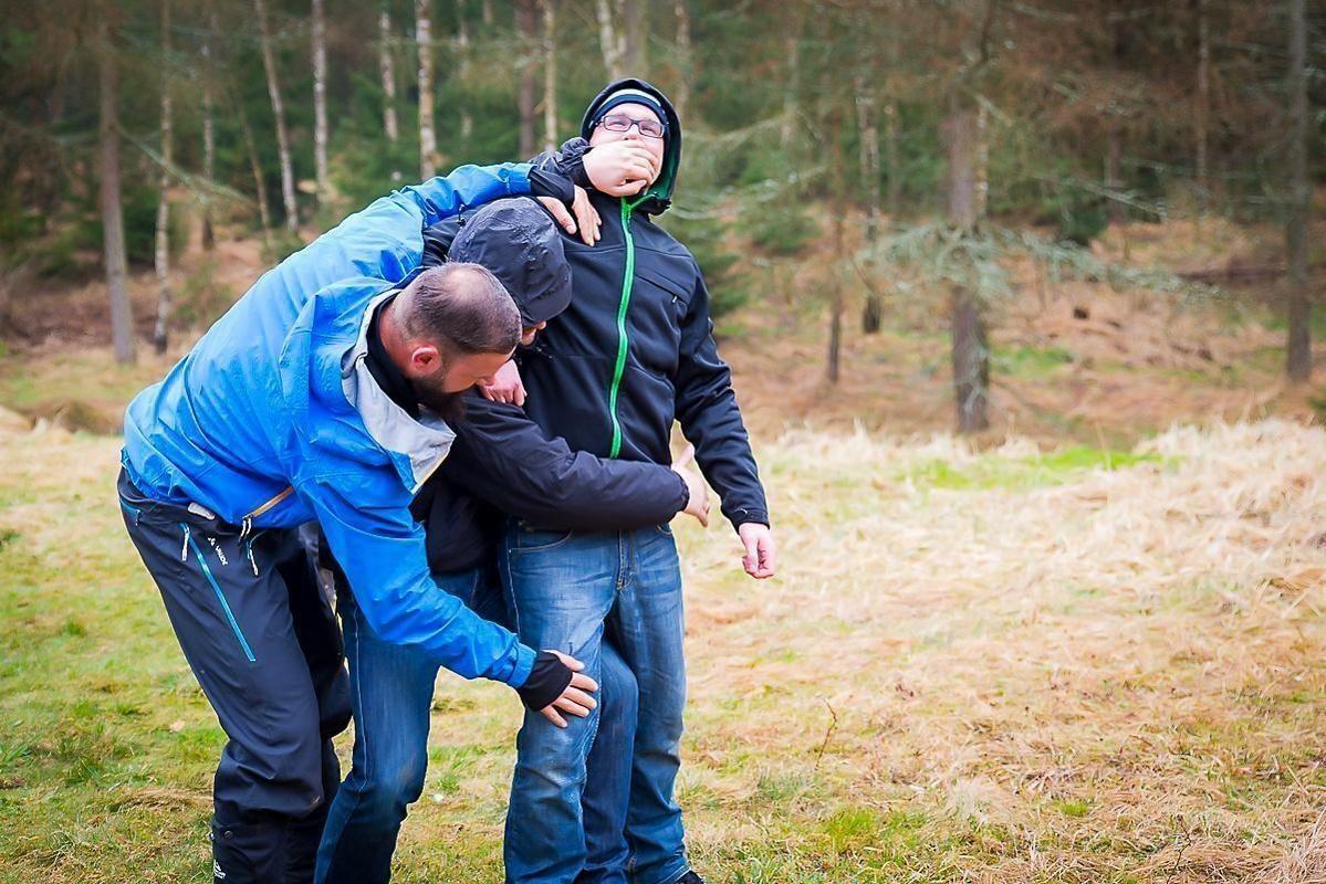 Zwei Personen üben eine Selbstverteidigungstechnik im Wald