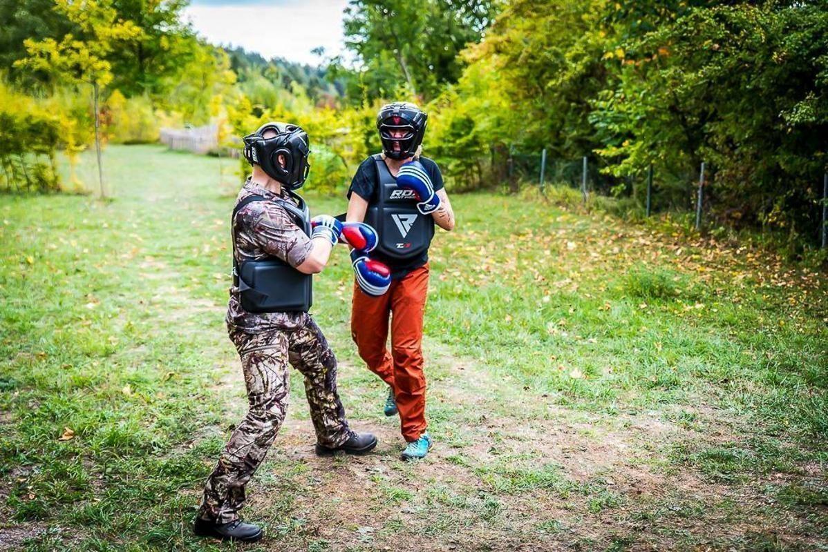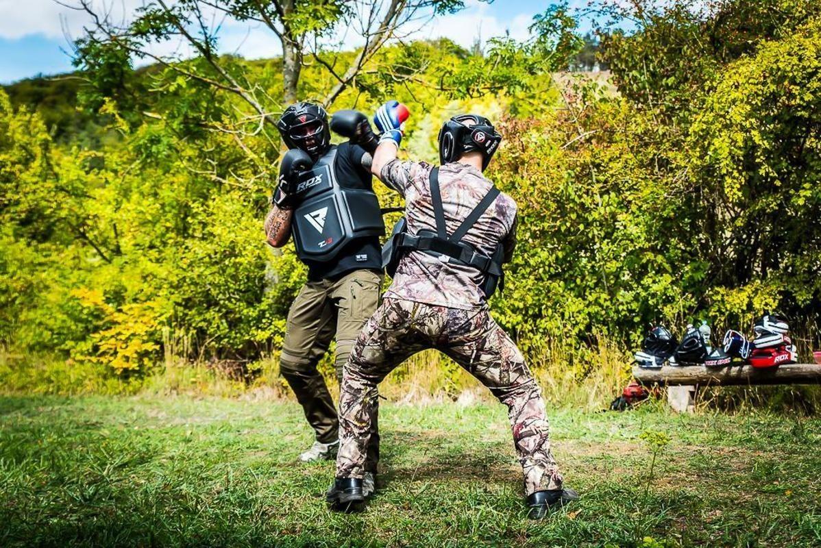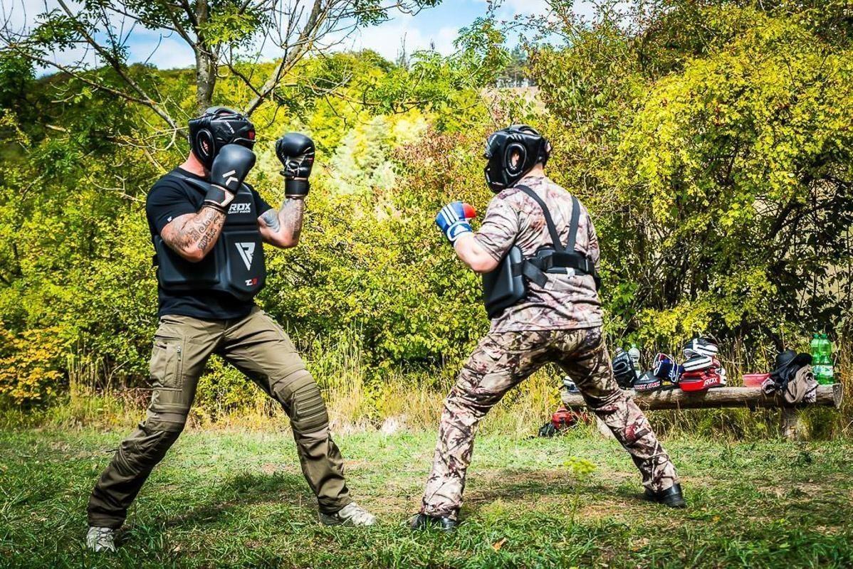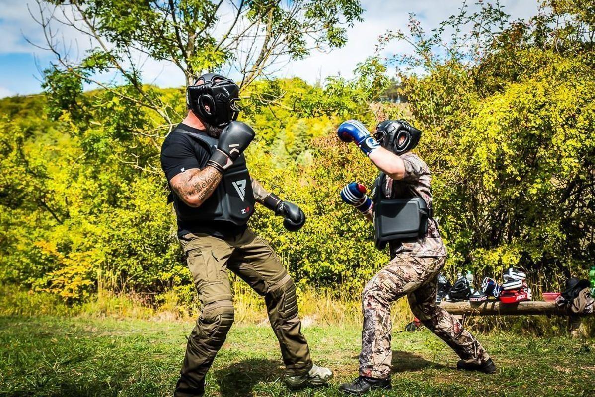 Zwei Personen in Schutzausrüstung üben Boxtechniken im Freien