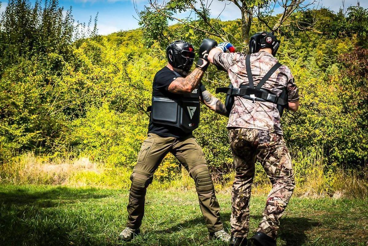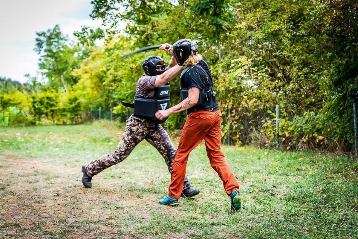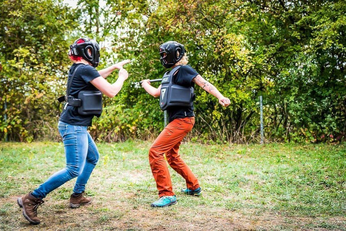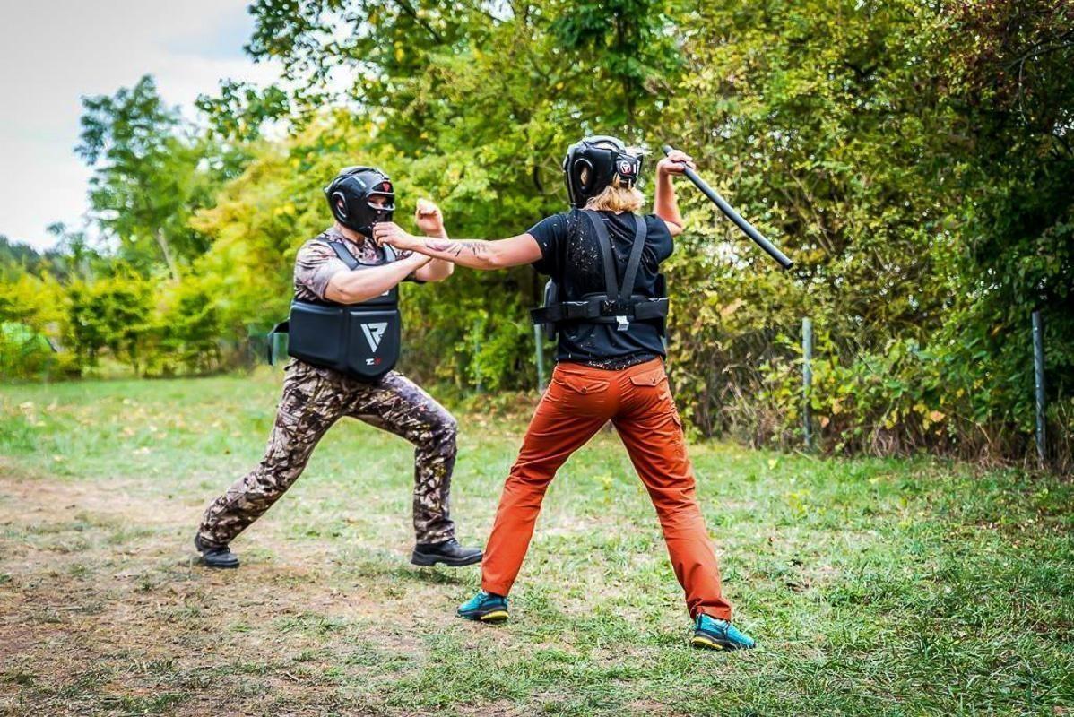 Zwei Personen in Schutzausrüstung üben einen Nahkampf im Freien