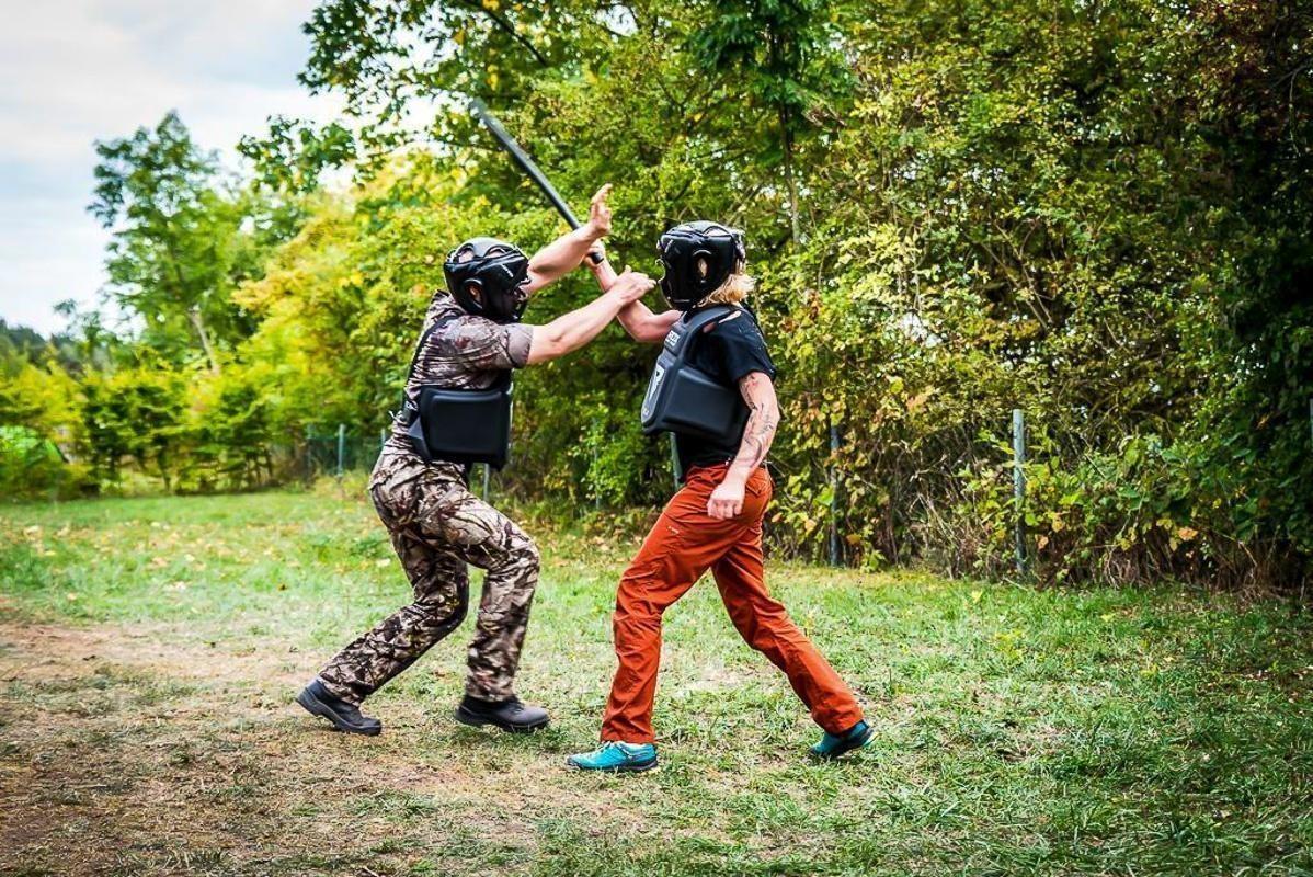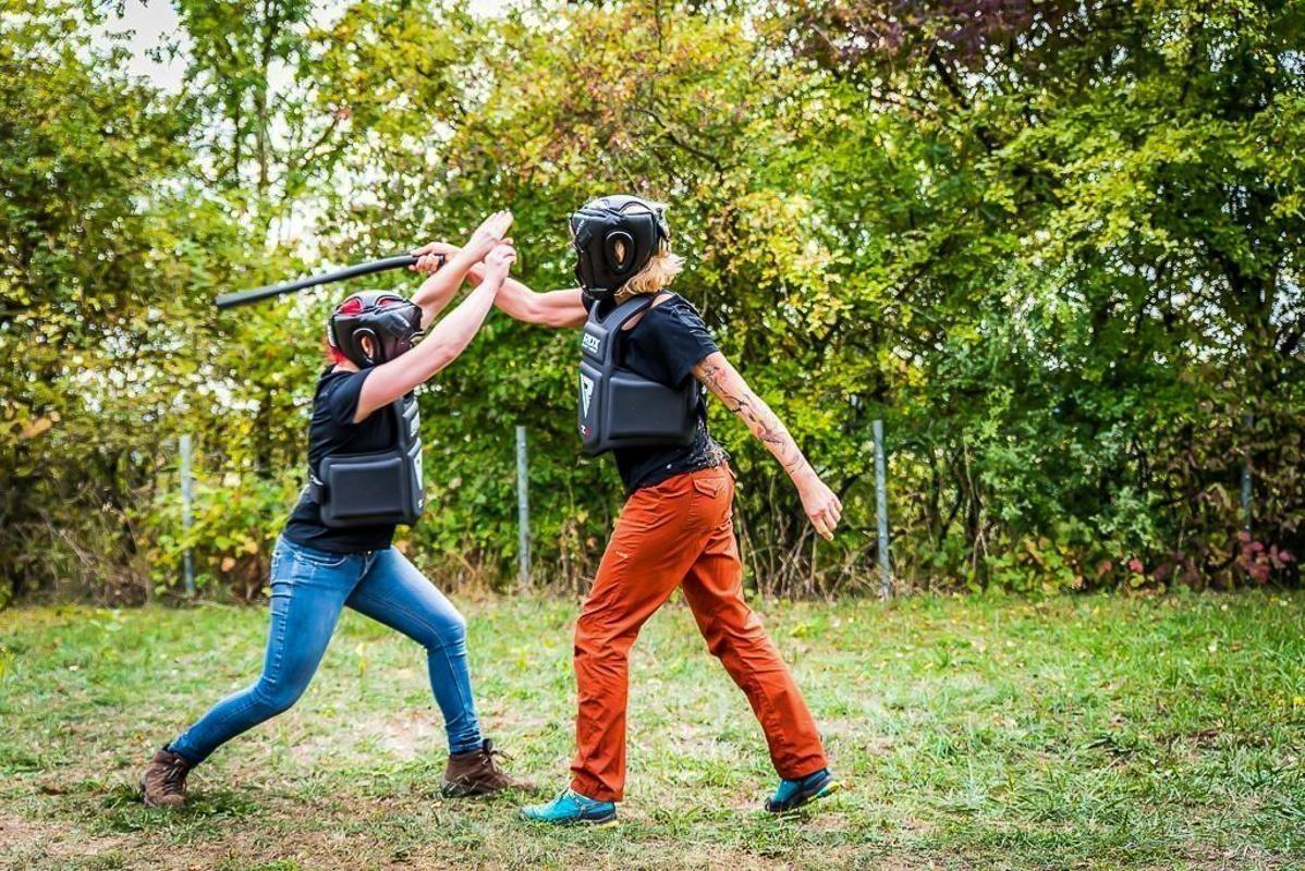 Zwei Personen in Schutzausrüstung üben einen Nahkampf mit einem Stock