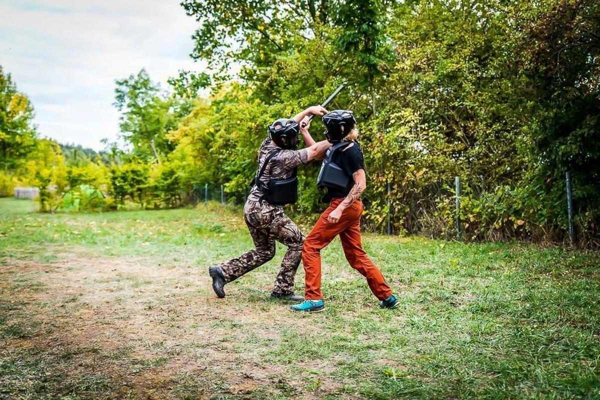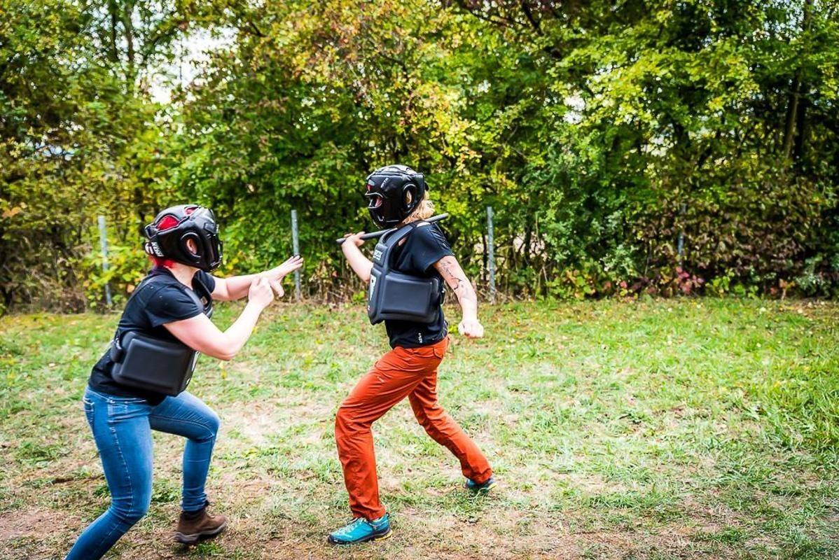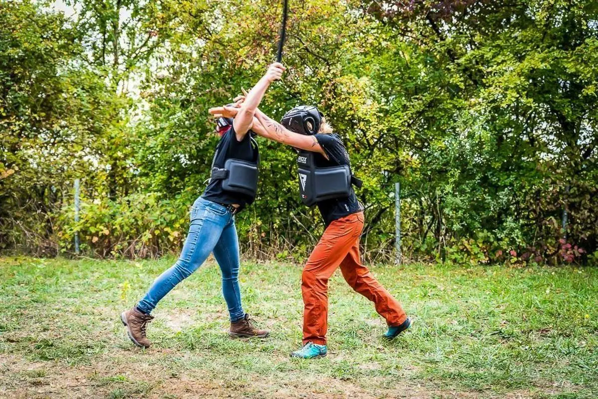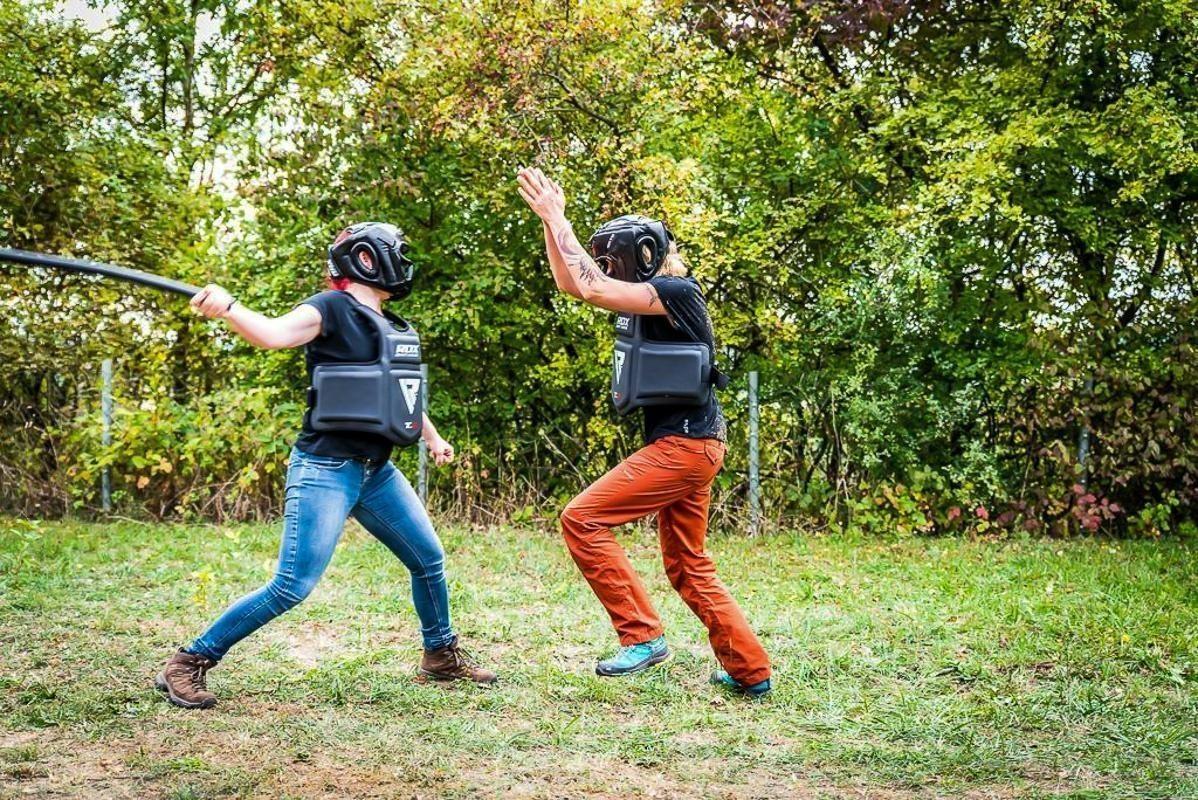 Zwei Personen in Schutzausrüstung üben einen Kampf im Freien