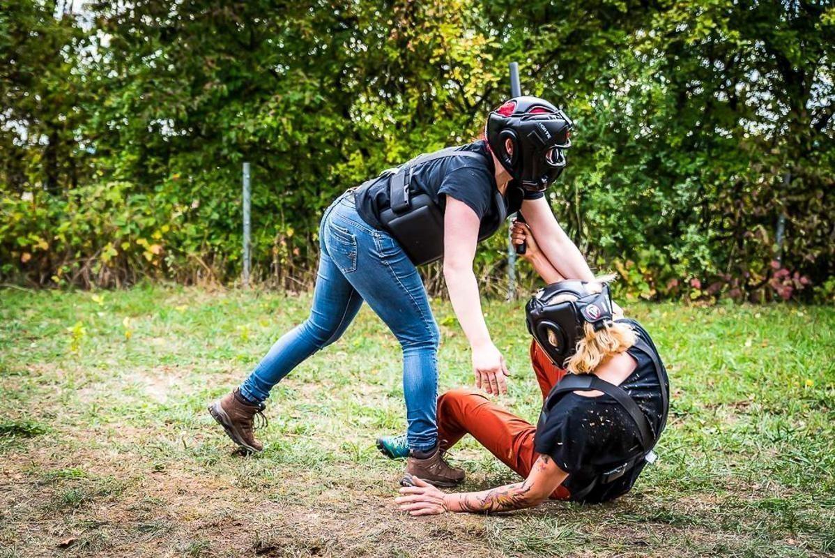 Zwei Personen in Schutzausrüstung üben Bodenkampf auf einer Wiese