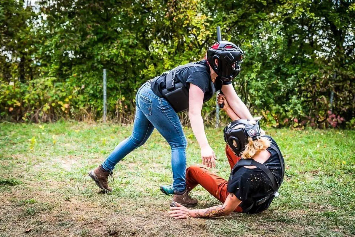 Ein zentraler Bestandteil des Kurses war das Training im Bodenkampf, bei dem die Teilnehmer lernten, sich in verschiedenen Situationen zu behaupten. Die Übungen umfassten auch den Umgang mit Schutzausrüstung, was es den Teilnehmern ermöglichte, realistische Szenarien zu simulieren. Durch das Üben von Techniken im Freien wurde die Reaktionsfähigkeit in stressigen Situationen gefördert. Die Teilnehmer arbeiteten an ihrer Distanzkontrolle und lernten, wie sie sich effektiv aus Clinch-Situationen befreien konnten.