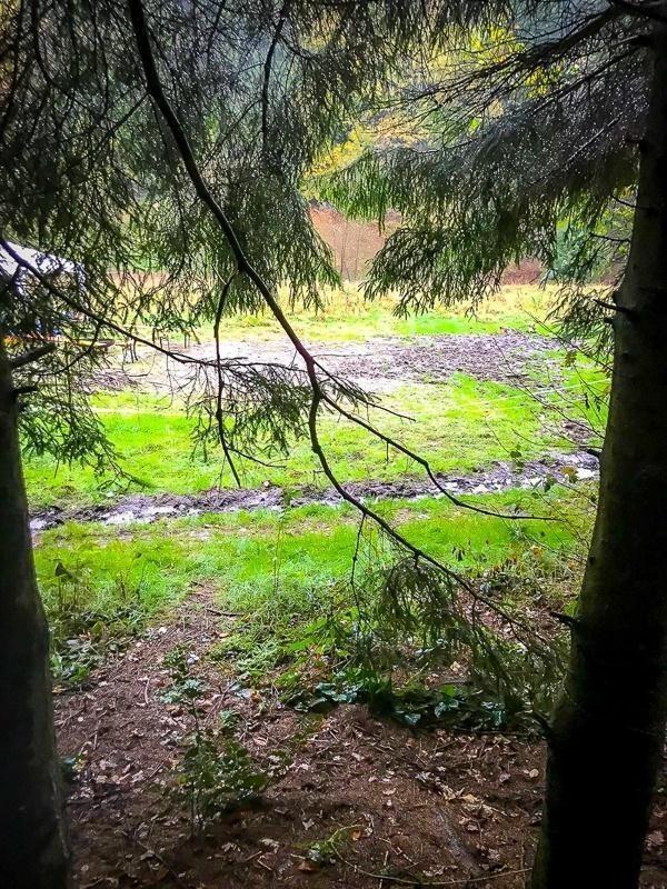 Blick durch Baumzweige auf eine grüne Wiese mit feuchtem Boden