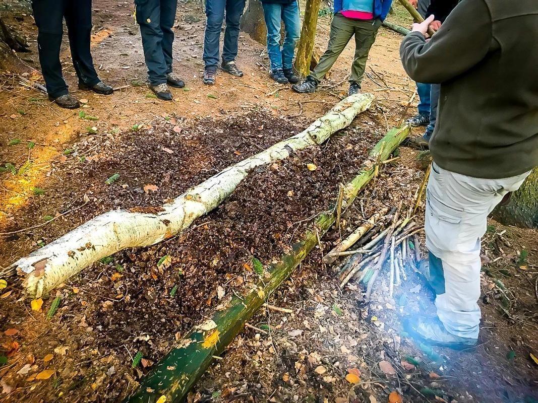 Ein Teilnehmer demonstriert eine Technik an einem Baumstamm, während andere zuschauen
