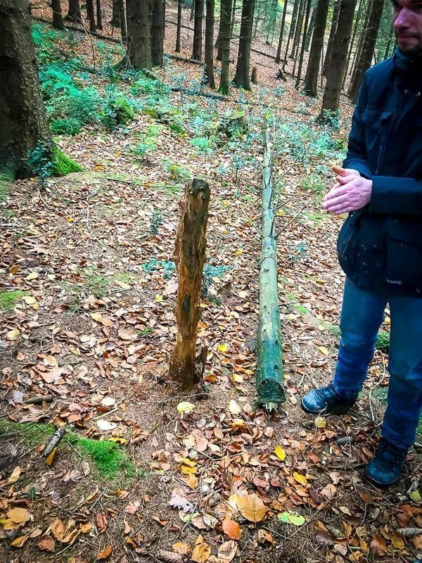 Holzstück steht senkrecht im Wald, daneben liegt ein längerer Baumstamm