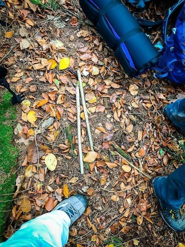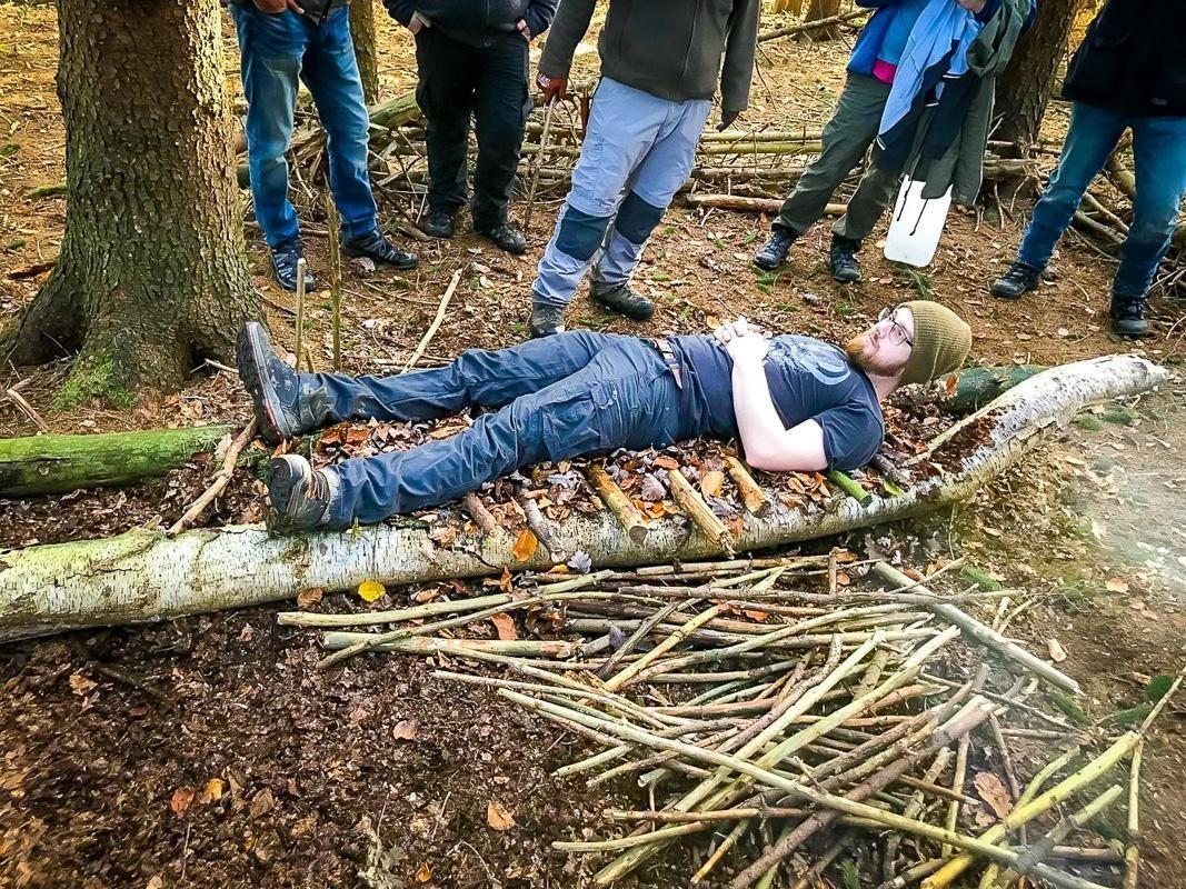 Improvisierte Trage aus Ästen mit liegender Person im Wald