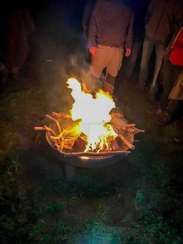 Kleine Flamme mit Rauch aus einem Feuerkorb, umgeben von Personen