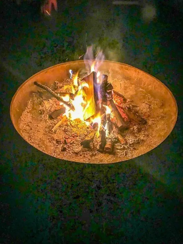 Kleine Flamme mit Rauch aus Holzscheiten in einer Feuerschale