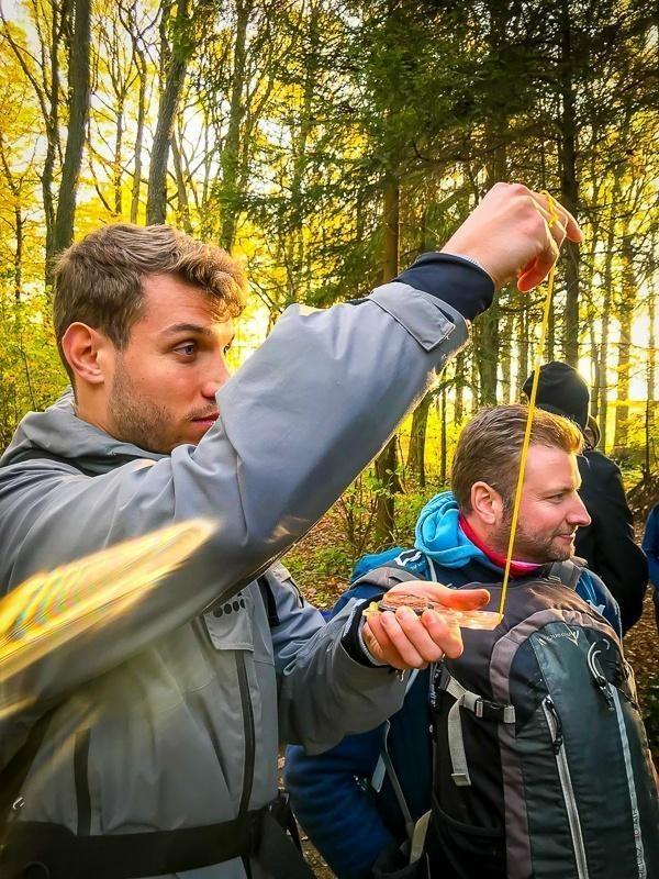 Mann hält eine Schnur in der Hand und misst die Länge im Wald