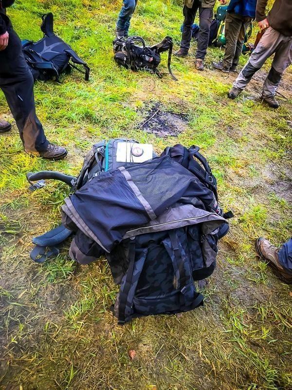 Rucksack liegt auf dem Boden, umgeben von weiteren Rucksäcken und Personen