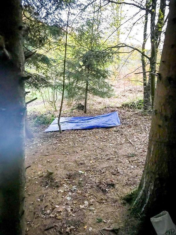 Tarp-Notunterkunft und Jacke hängen an Bäumen im Wald