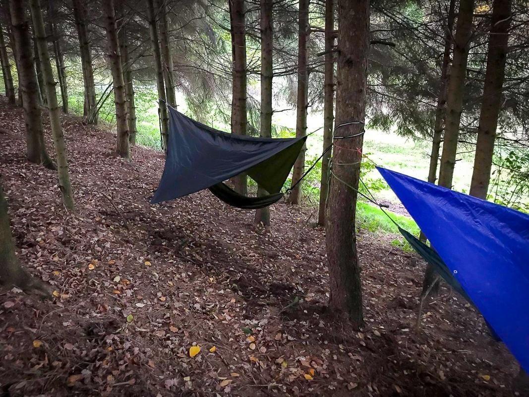 Tarp-Notunterkunft hängt über einer Hängematte zwischen Bäumen