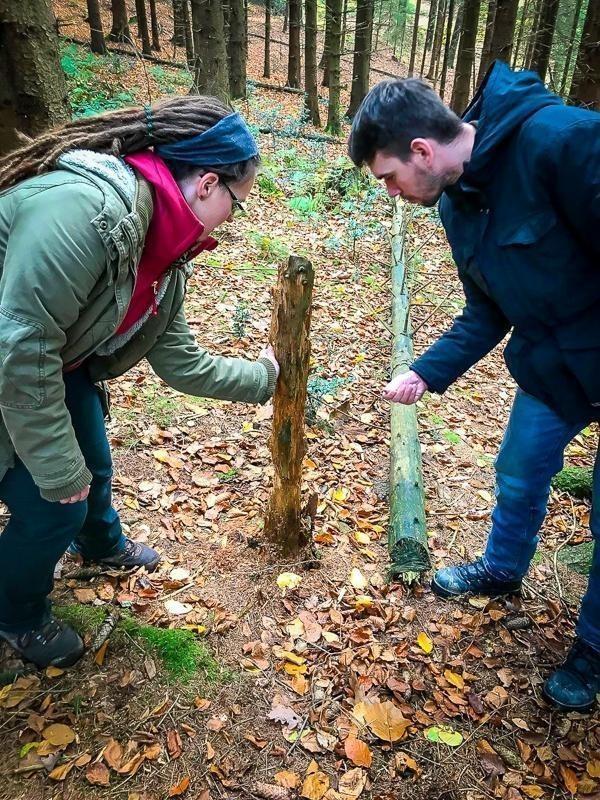 Zwei Personen untersuchen einen aufrechten Holzstamm im Wald