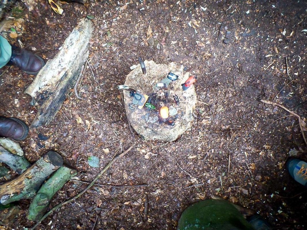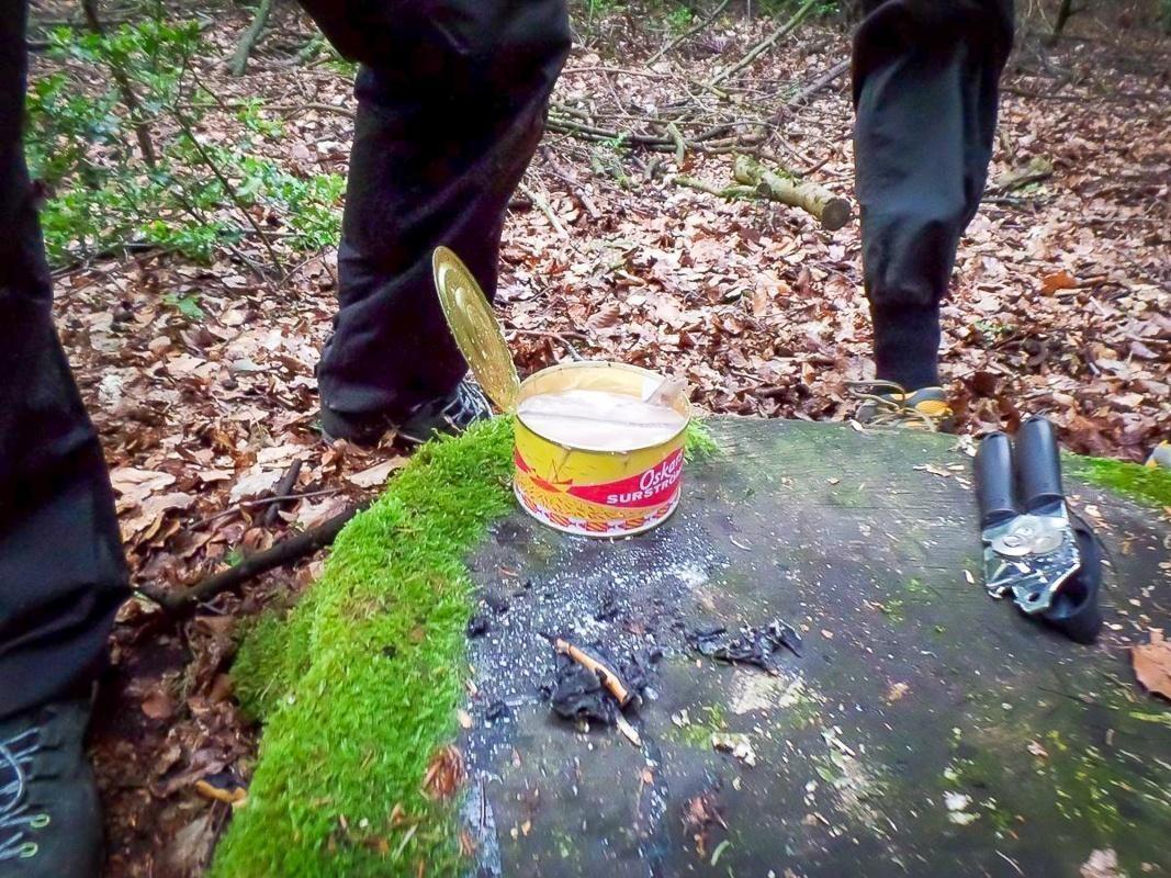 Dose mit geöffnetem Deckel steht auf einem moosbedeckten Stein, daneben ein Feuerstelle