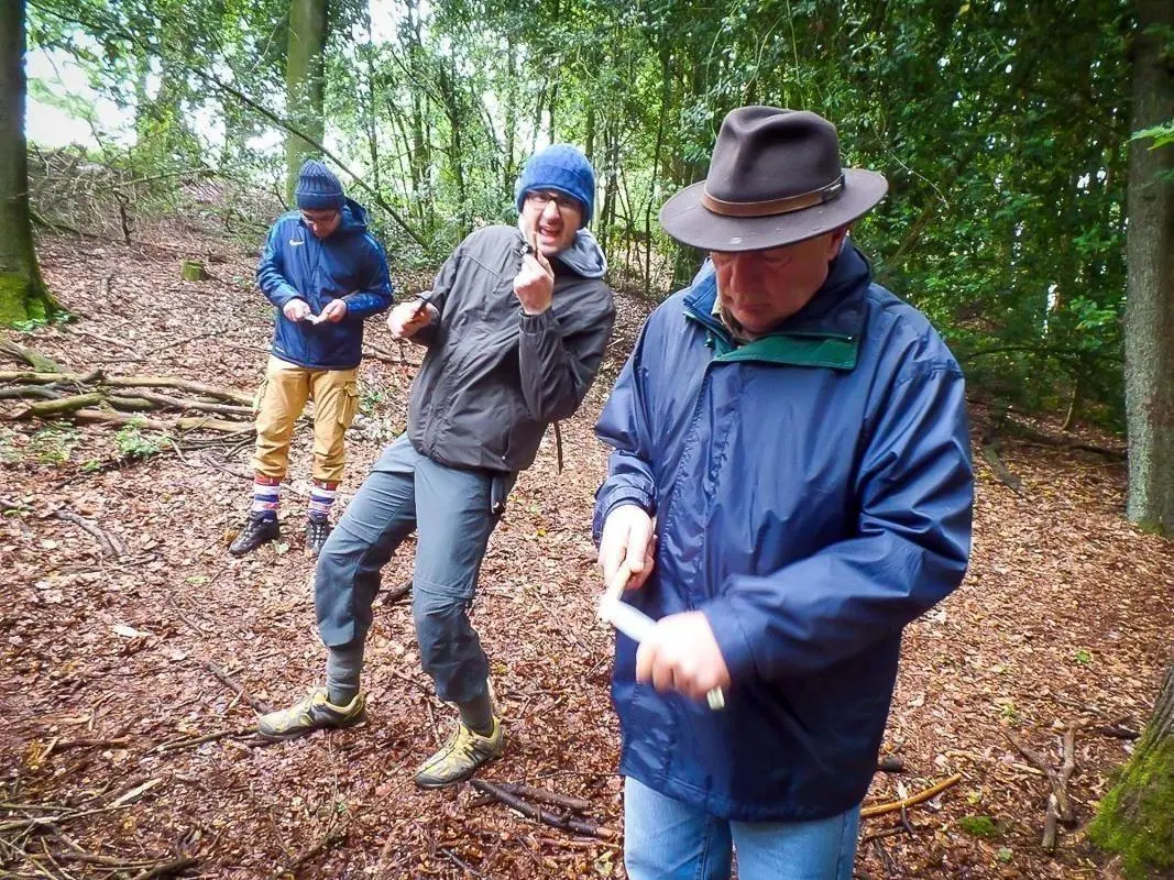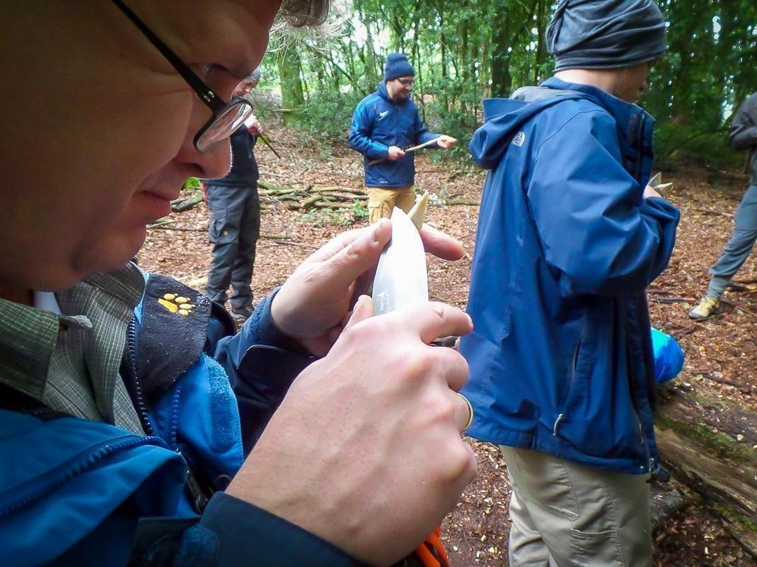 Gruppe übt Holzarbeit mit Messern in einem Waldgebiet