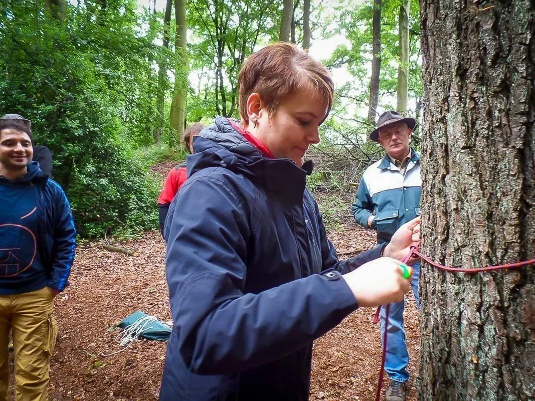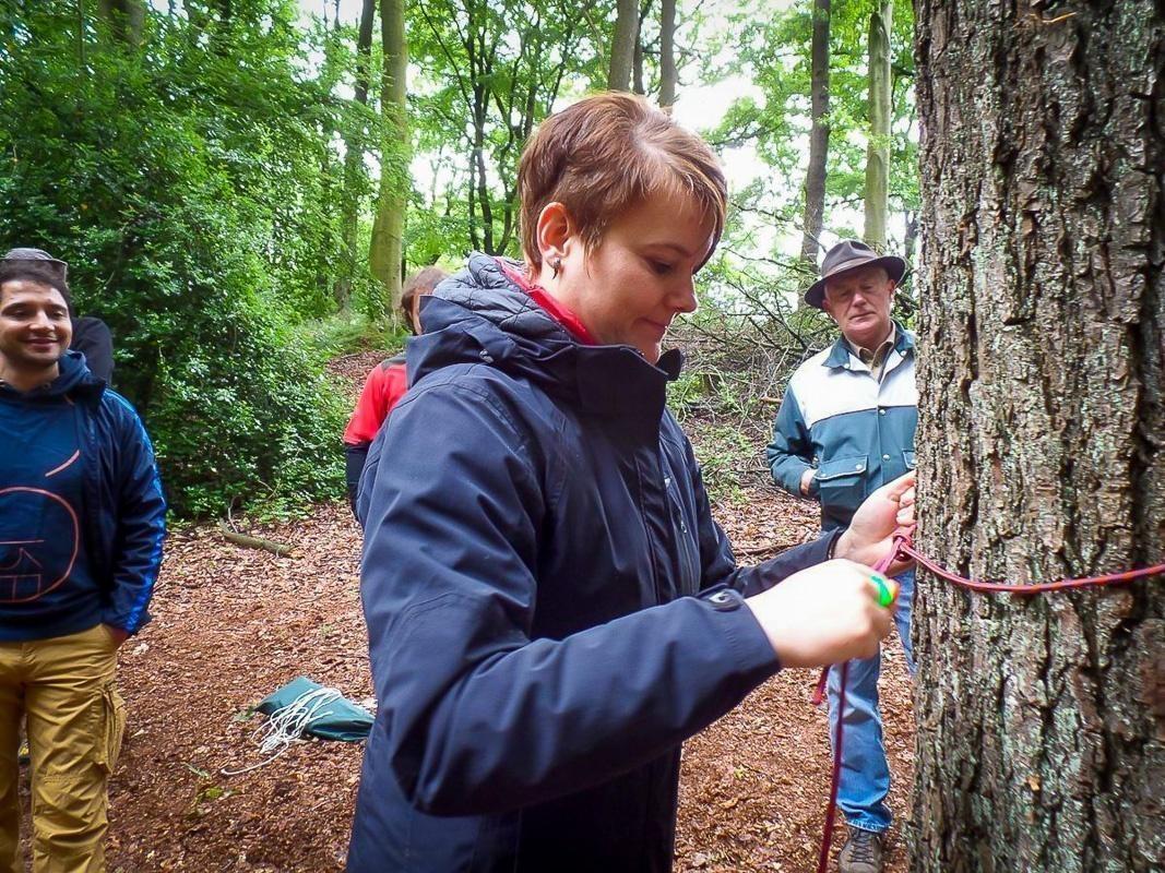 Frau knotet ein Seil an einen Baumstamm im Wald