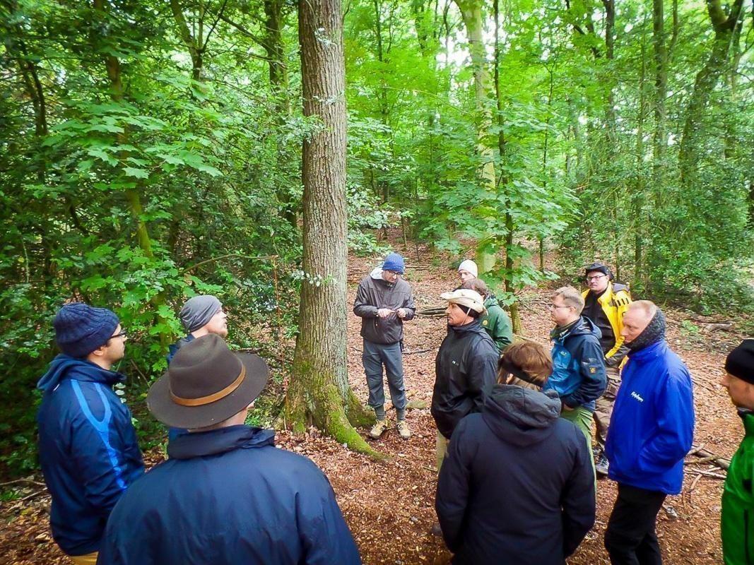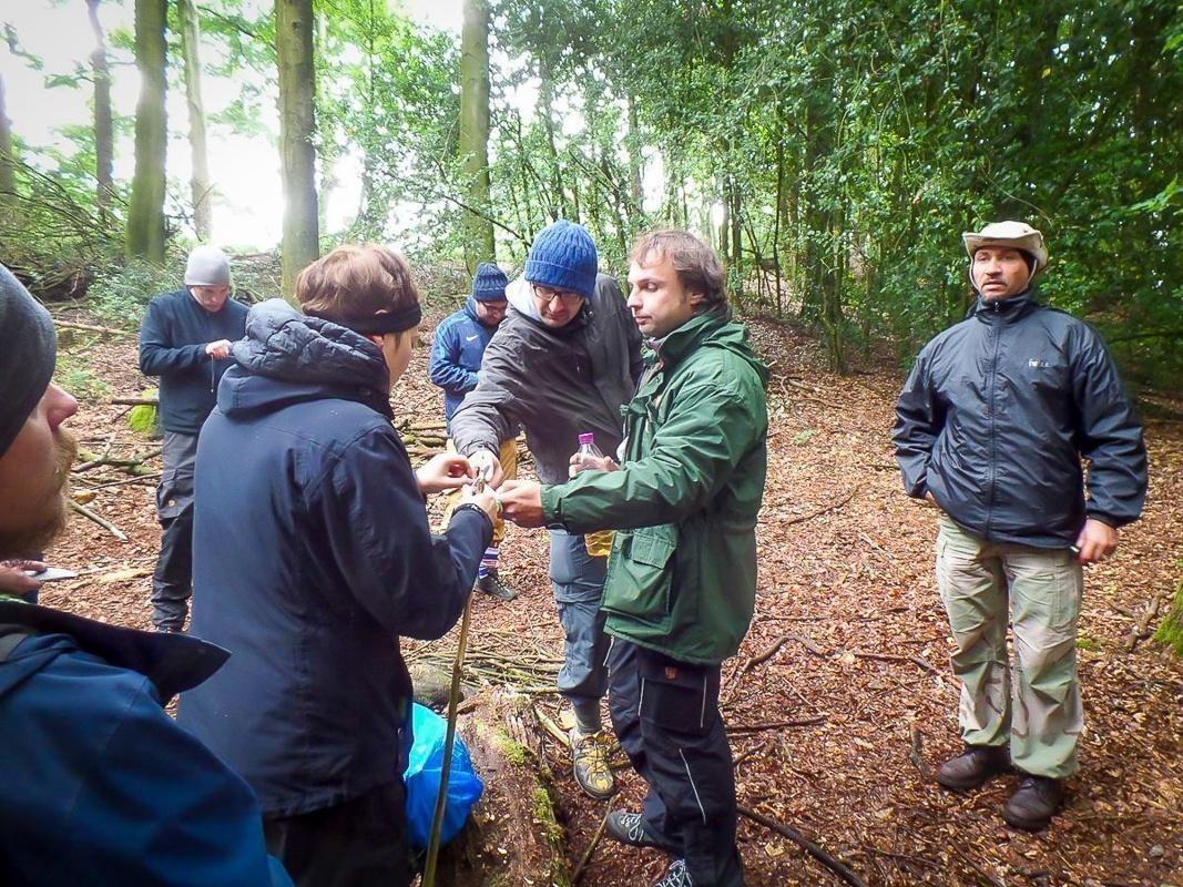 Gruppe betrachtet den Boden im Wald, während jemand eine Technik demonstriert