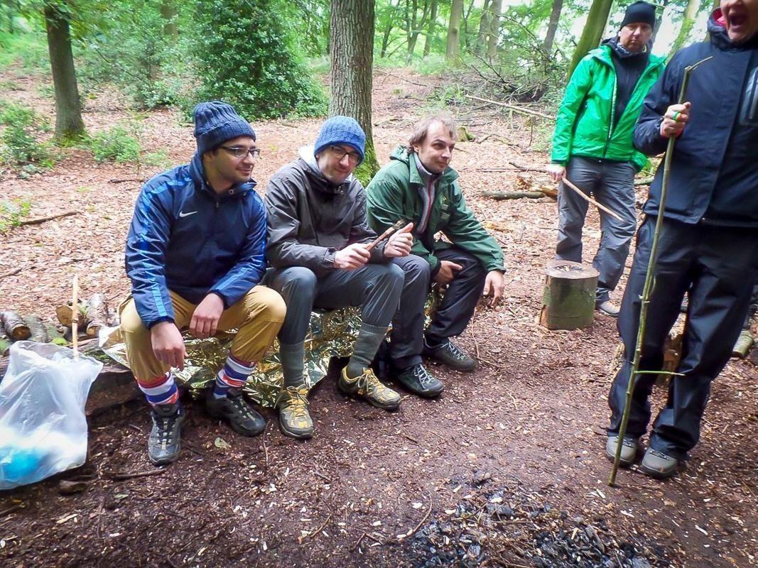 Gruppe sitzt im Wald um einen Holzstamm, diskutiert über Überlebenstechniken