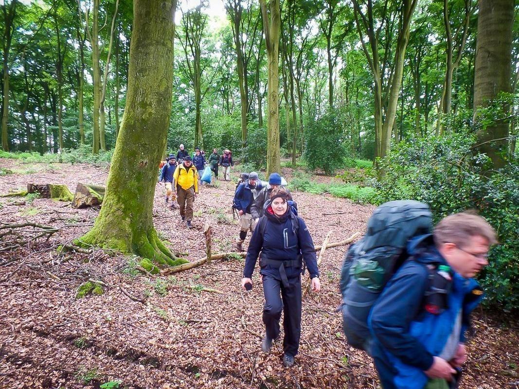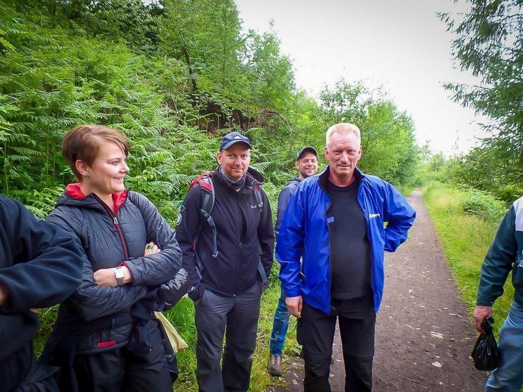 Gruppe steht auf einem Waldweg, umgeben von Bäumen und Sträuchern