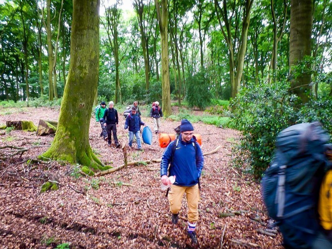 Gruppe wandert mit Rucksäcken durch einen bewaldeten Bereich mit Laub