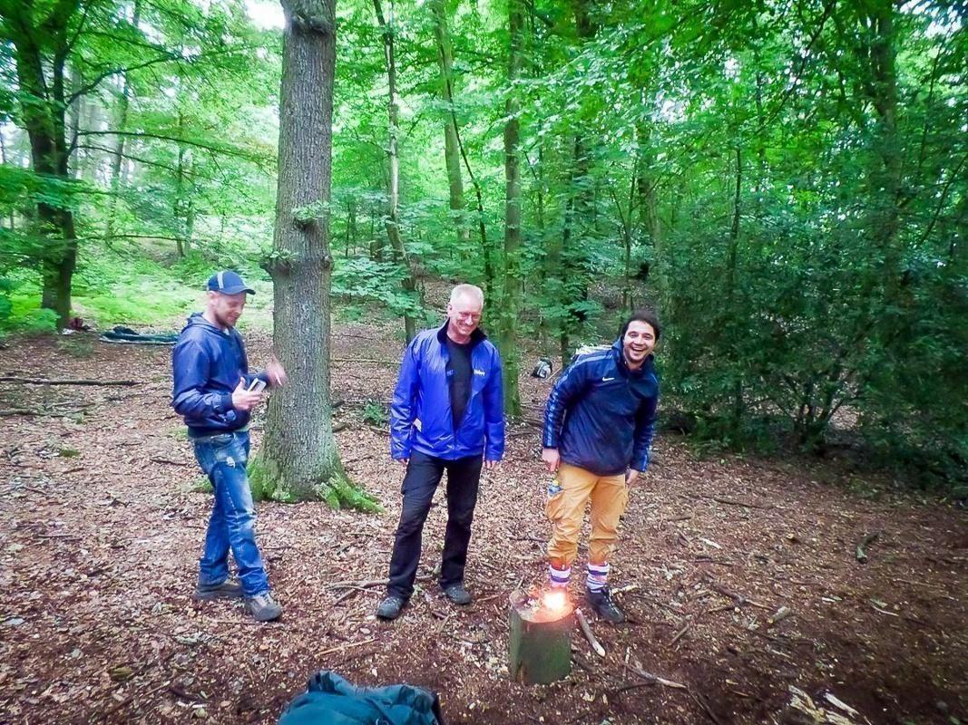 Kleines Bodenfeuer auf einem Baumstumpf im Wald, drei Personen stehen daneben