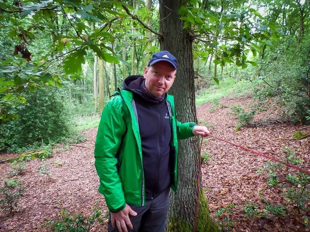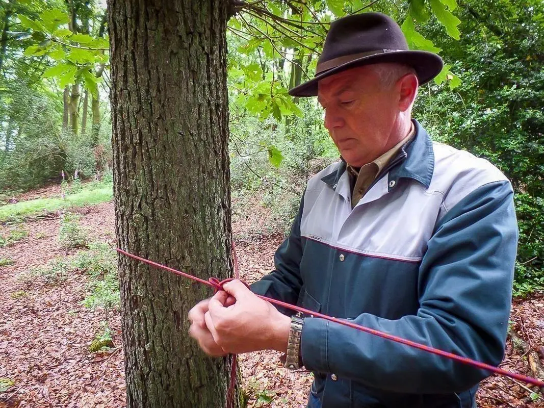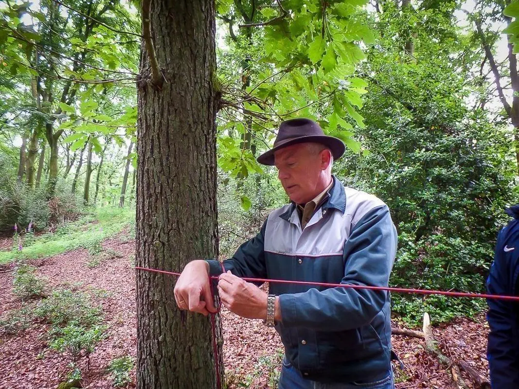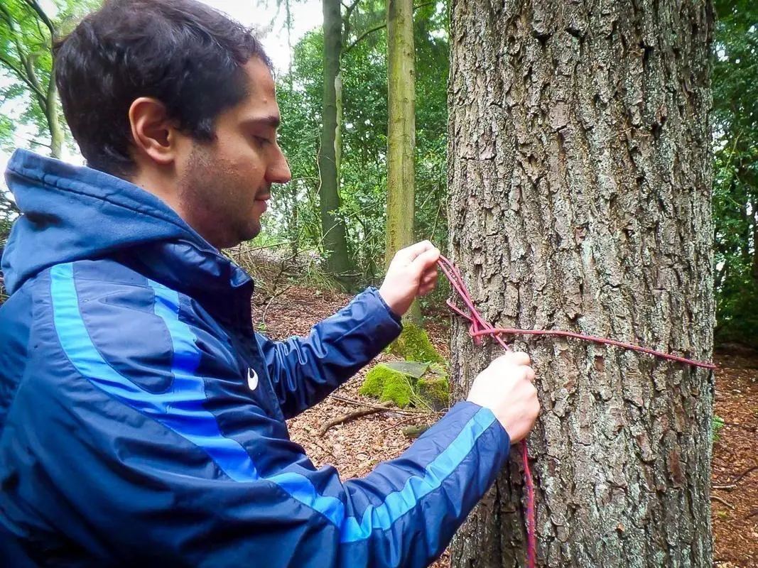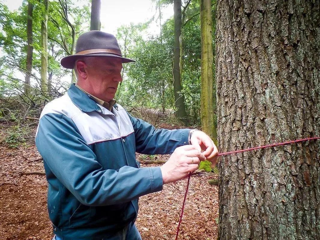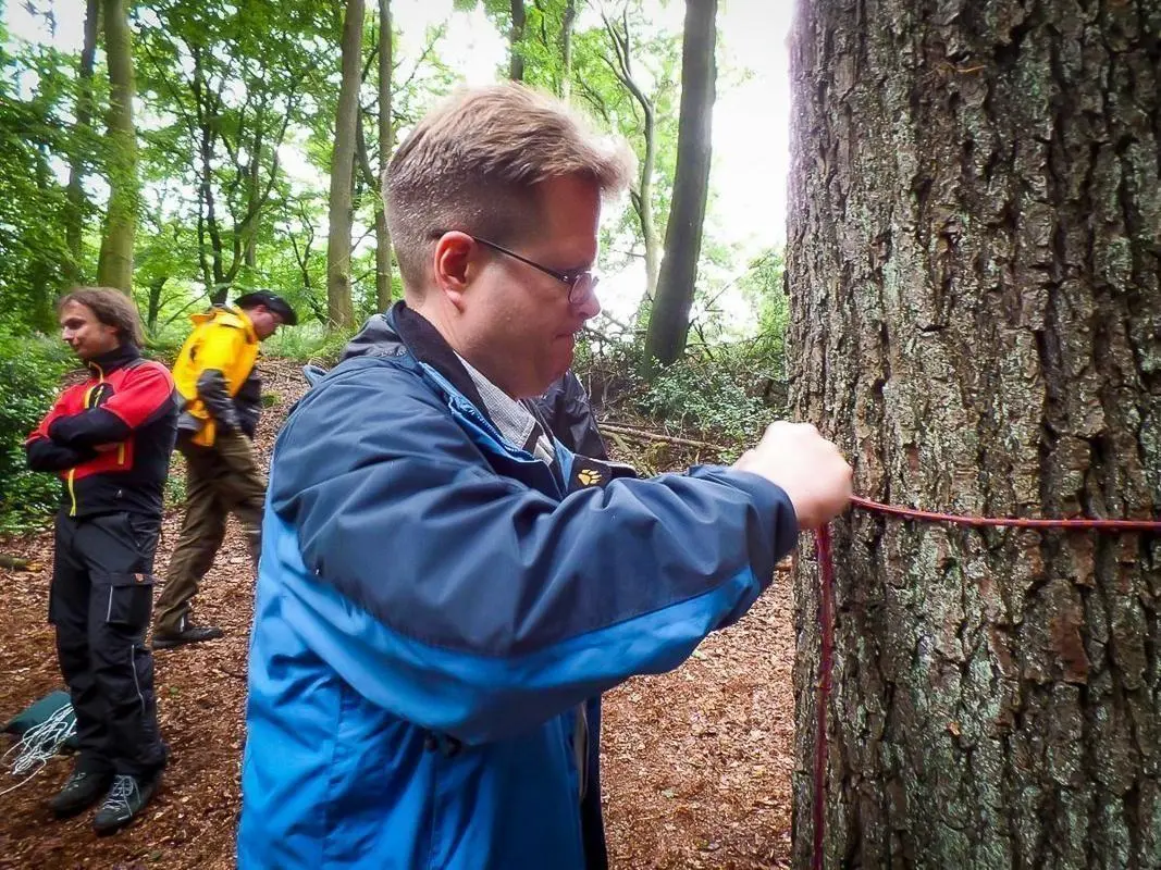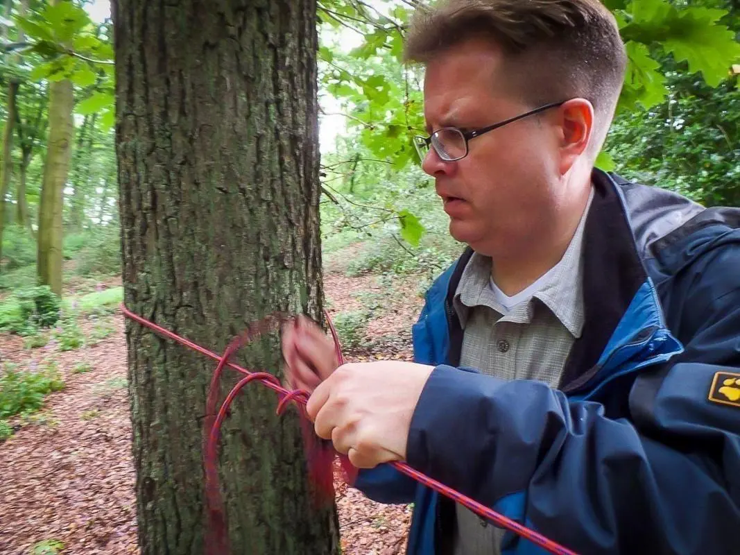 Person umschlingt Baumstamm mit einem Seil in einem Waldgebiet