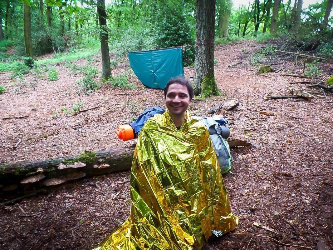 Mann in einer Rettungsdecke sitzt vor einem Rucksack und einer Tarp-Notunterkunft