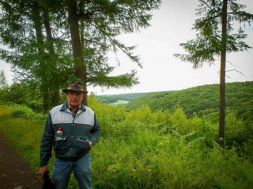 Mann steht auf einem Waldweg zwischen Bäumen mit Blick auf eine grüne Hügellandschaft