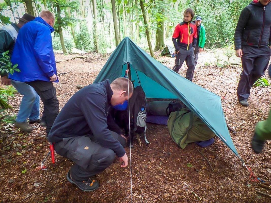 Mann überprüft die Abspannung einer Tarp-Notunterkunft im Wald