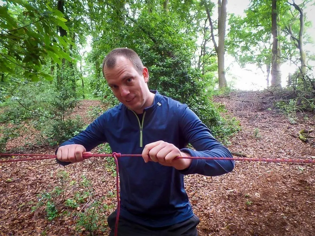 Mann spannt ein rotes Seil zwischen zwei Bäumen im Wald