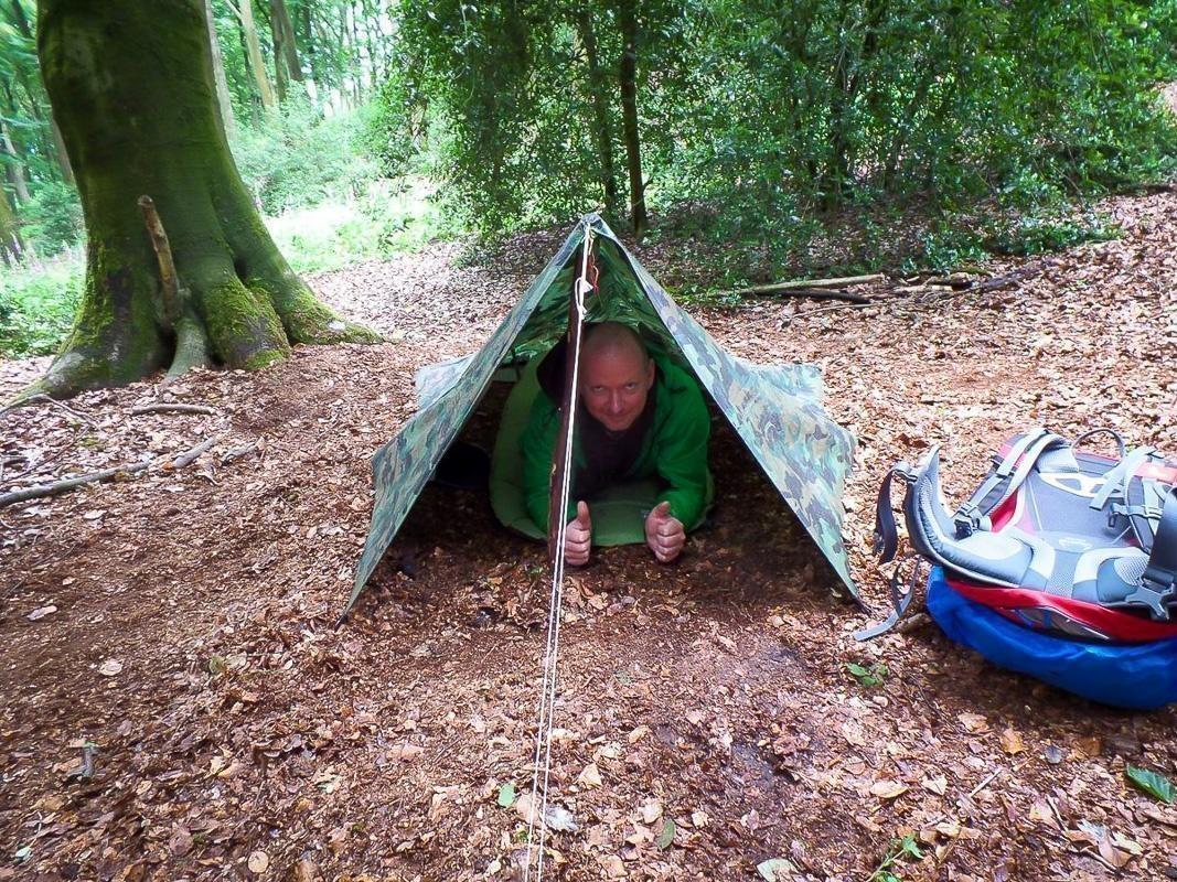 Tarp-Notunterkunft unter Bäumen mit Rucksack daneben auf Laubboden