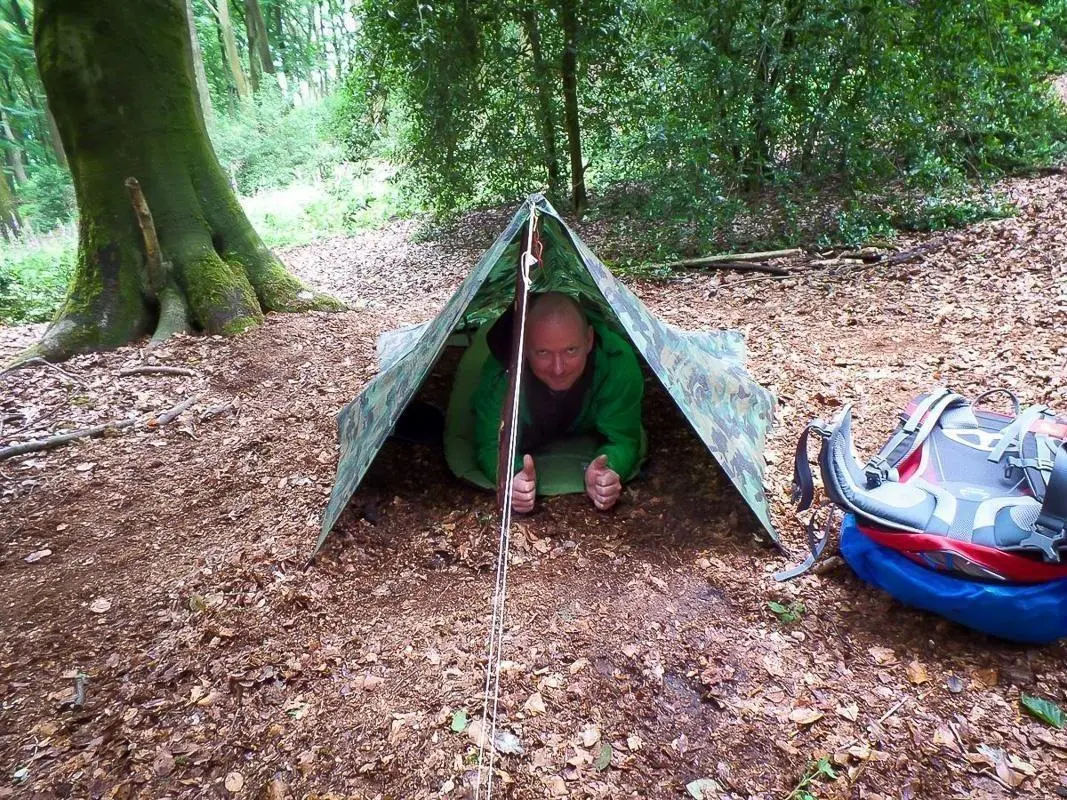 Mann sitzt vor einer Tarp-Notunterkunft im Wald, Rucksäcke liegen daneben
