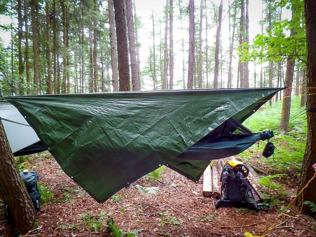 Tarp-Notunterkunft hängt zwischen Bäumen, darunter Rucksack und Holzunterlage