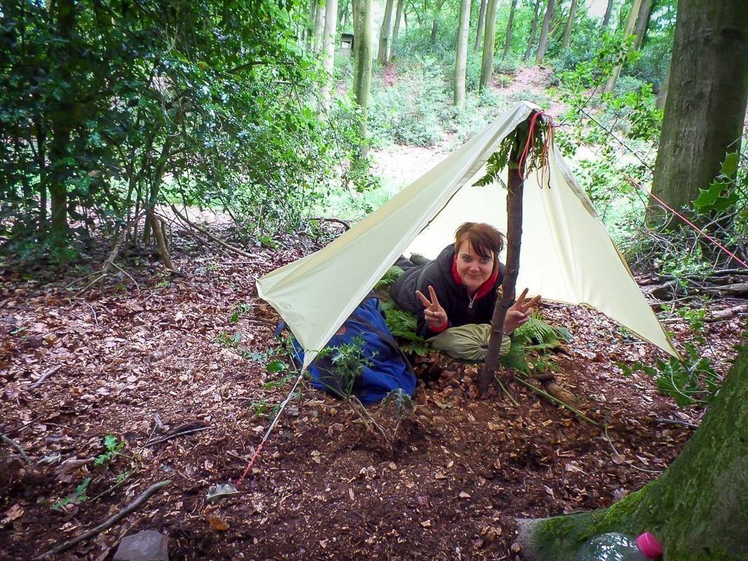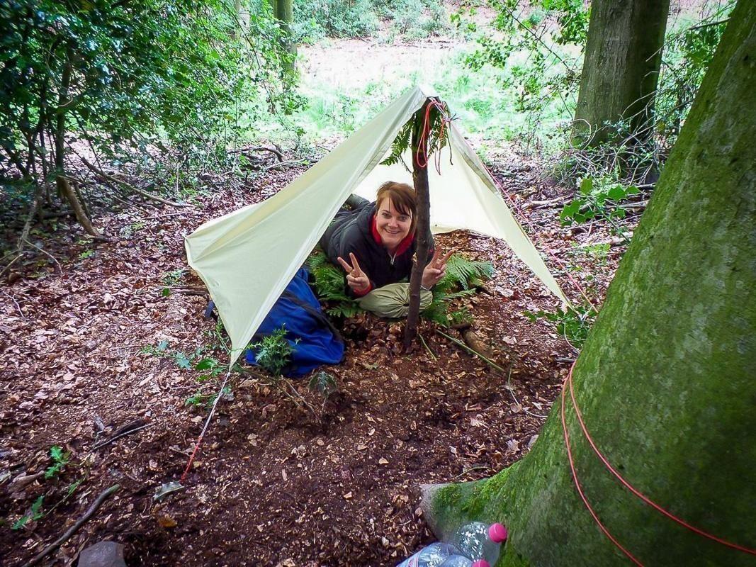 Tarp-Notunterkunft zwischen Bäumen, Abspannschnüre und Unterholz sichtbar