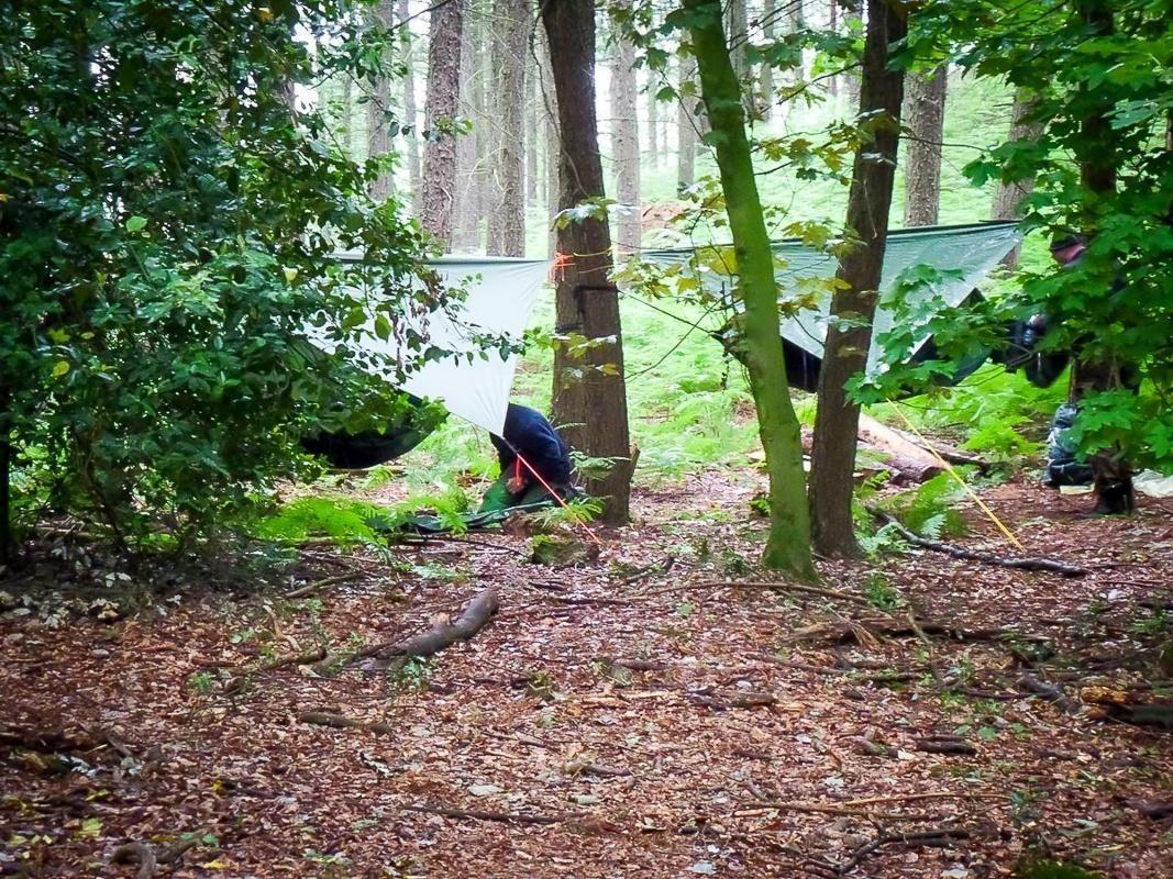 Tarp-Notunterkunft ist zwischen Bäumen gespannt, Rucksack liegt im Vordergrund