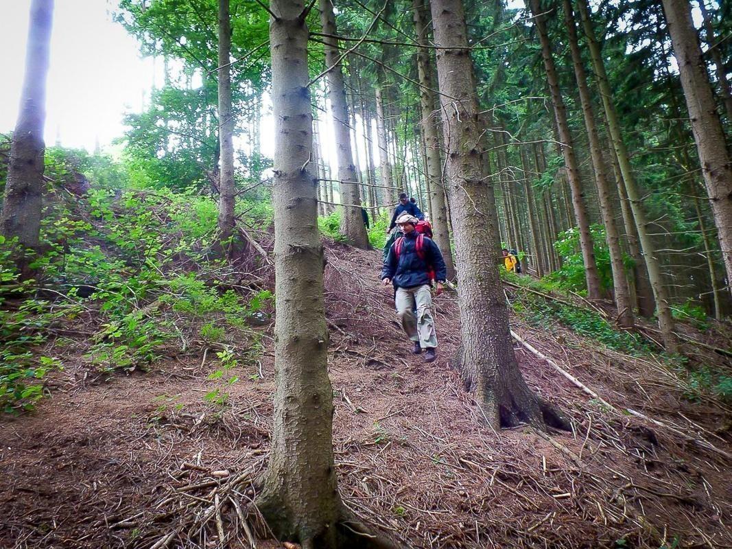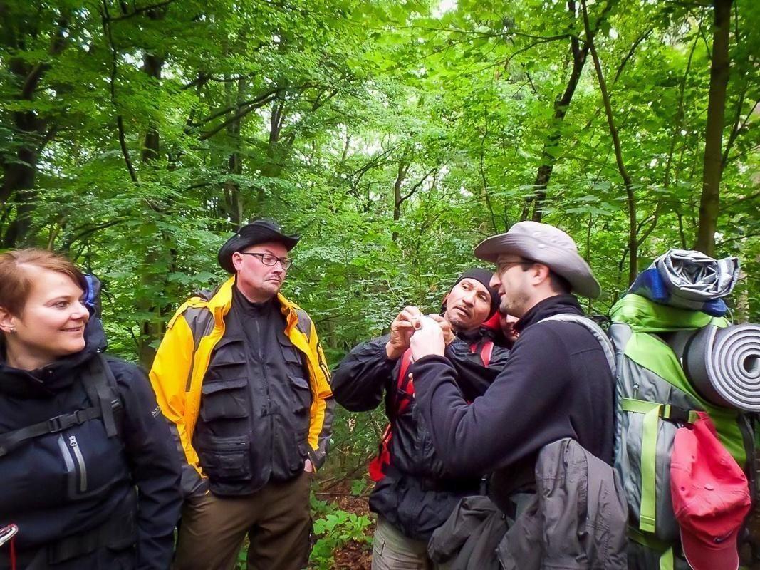 Gruppe mit Rucksäcken steht auf Waldweg und bespricht die Route