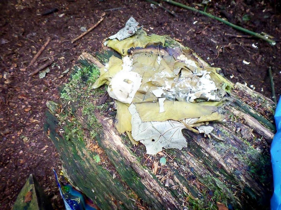Zunder aus Blättern und Rinde auf einem Baumstamm platziert
