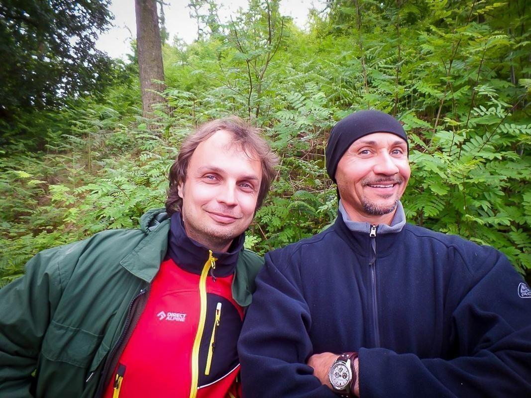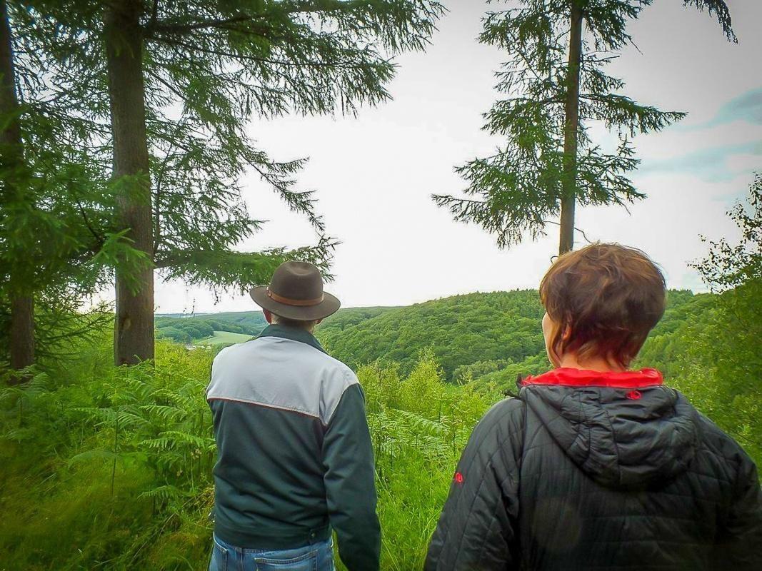 Zwei Personen stehen im Wald und blicken auf eine bewaldete Landschaft